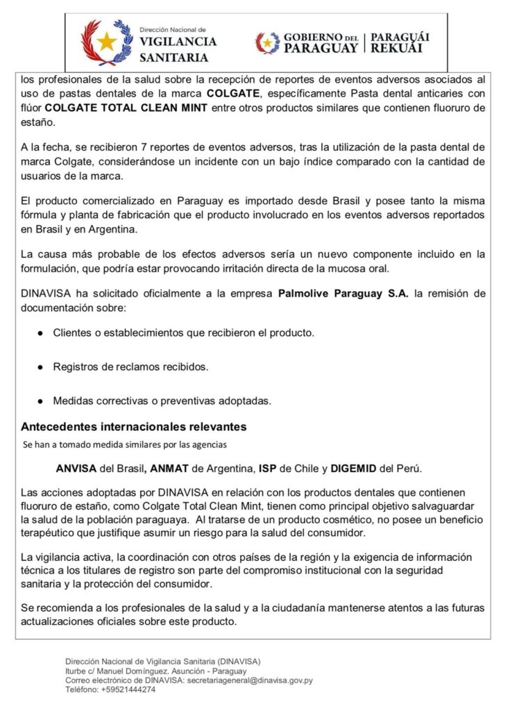 La Dirección Nacional de Vigilancia Sanitaria (DINAVISA) informó este jueves la suspensión temporal del uso y comercialización del producto “Colgate Total Clean Mint”, tras haberse recibido siete reportes de reacciones adversas relacionadas con su utilización.