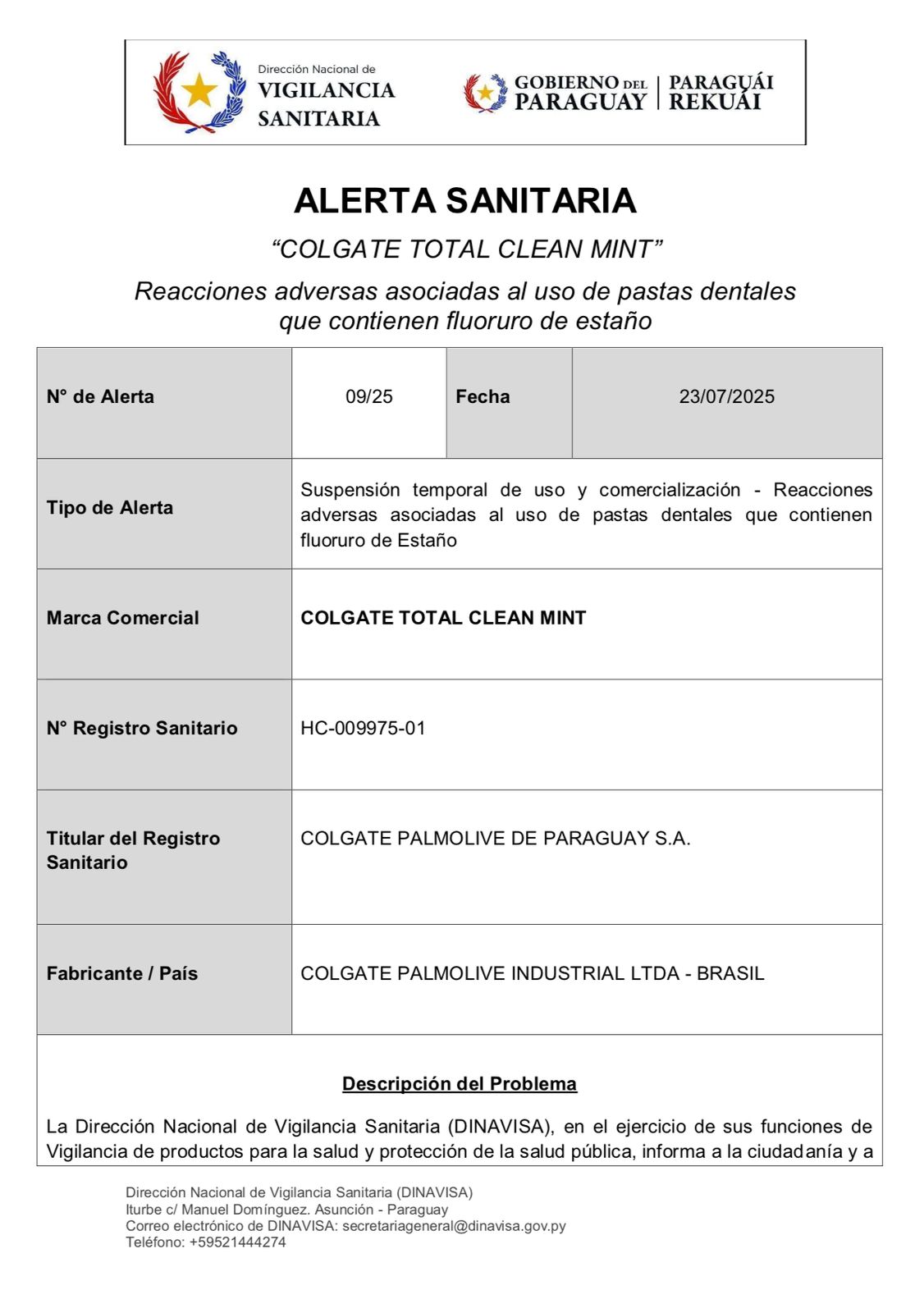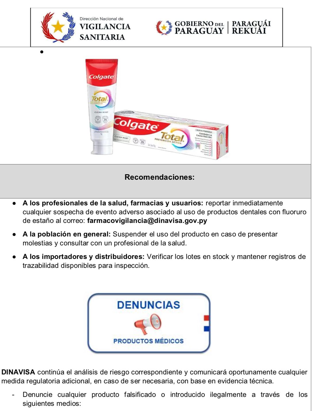 La Dirección Nacional de Vigilancia Sanitaria (DINAVISA) informó este jueves la suspensión temporal del uso y comercialización del producto “Colgate Total Clean Mint”, tras haberse recibido siete reportes de reacciones adversas relacionadas con su utilización.