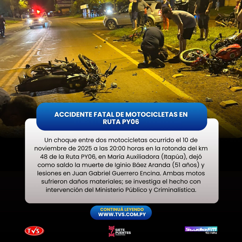 Un fatal choque entre dos motocicletas ocurrido anoche en la Ruta PY06, en la rotonda del kilómetro 48 del distrito de María Auxiliadora, departamento de Itapúa, resultó en la muerte de un conductor y lesiones en otro. El incidente, reportado a la Comisaría 16° local, ha conmocionado a la comunidad y pone de relieve una vez más los riesgos del tránsito en esta zona rural.