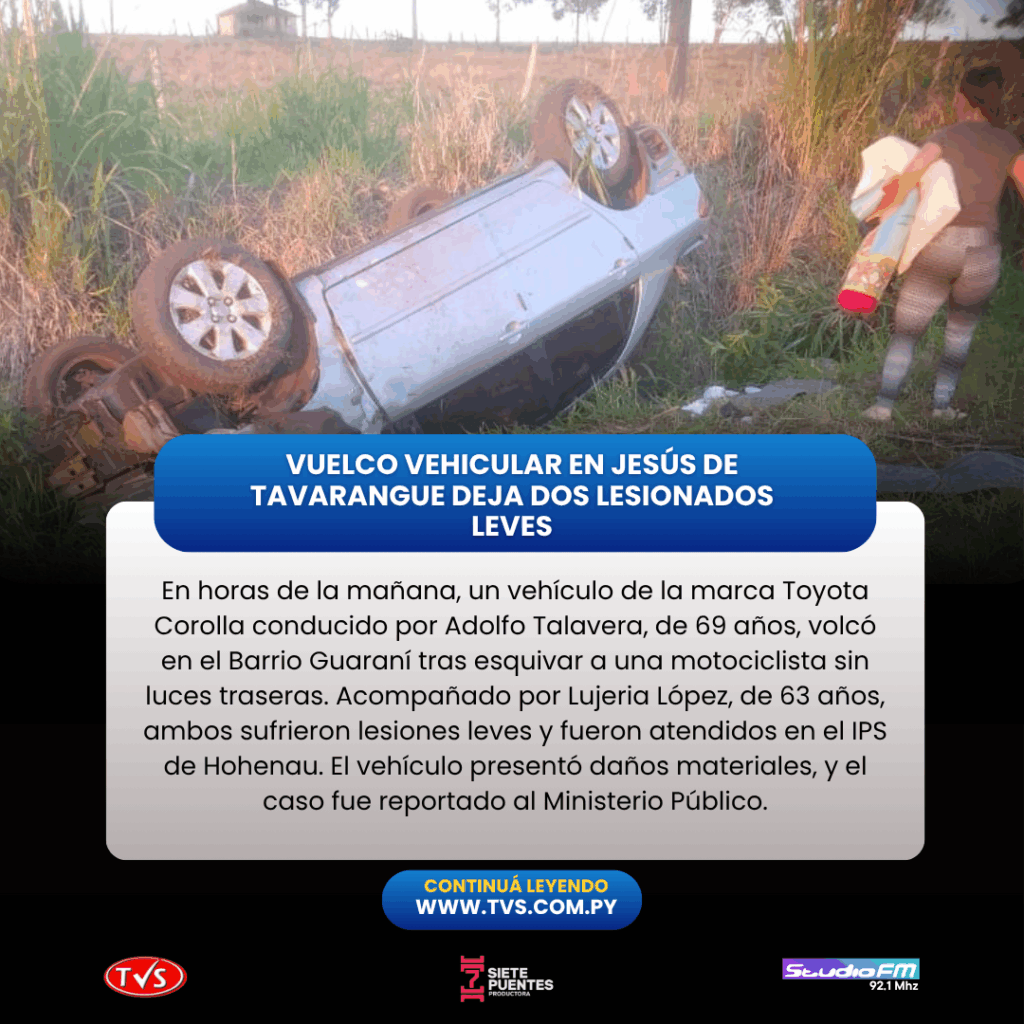 De acuerdo con el relato del conductor, Adolfo Talavera, de 69 años, el siniestro se produjo alrededor de las 05:30 horas mientras circulaba a bordo de un Toyota Corolla plateado, modelo 2008, con matrícula BBJ 945. Talavera, quien iba acompañado por Lujeria López, de 63 años, ambos residentes del Barrio Inmaculada de Jesús de Tavarangue, manifestó que avistó a una motociclista que avanzaba en la misma dirección sin luces traseras encendidas. Al intentar esquivarla, perdió el control del automóvil, lo que resultó en el vuelco del vehículo al costado de la ruta.