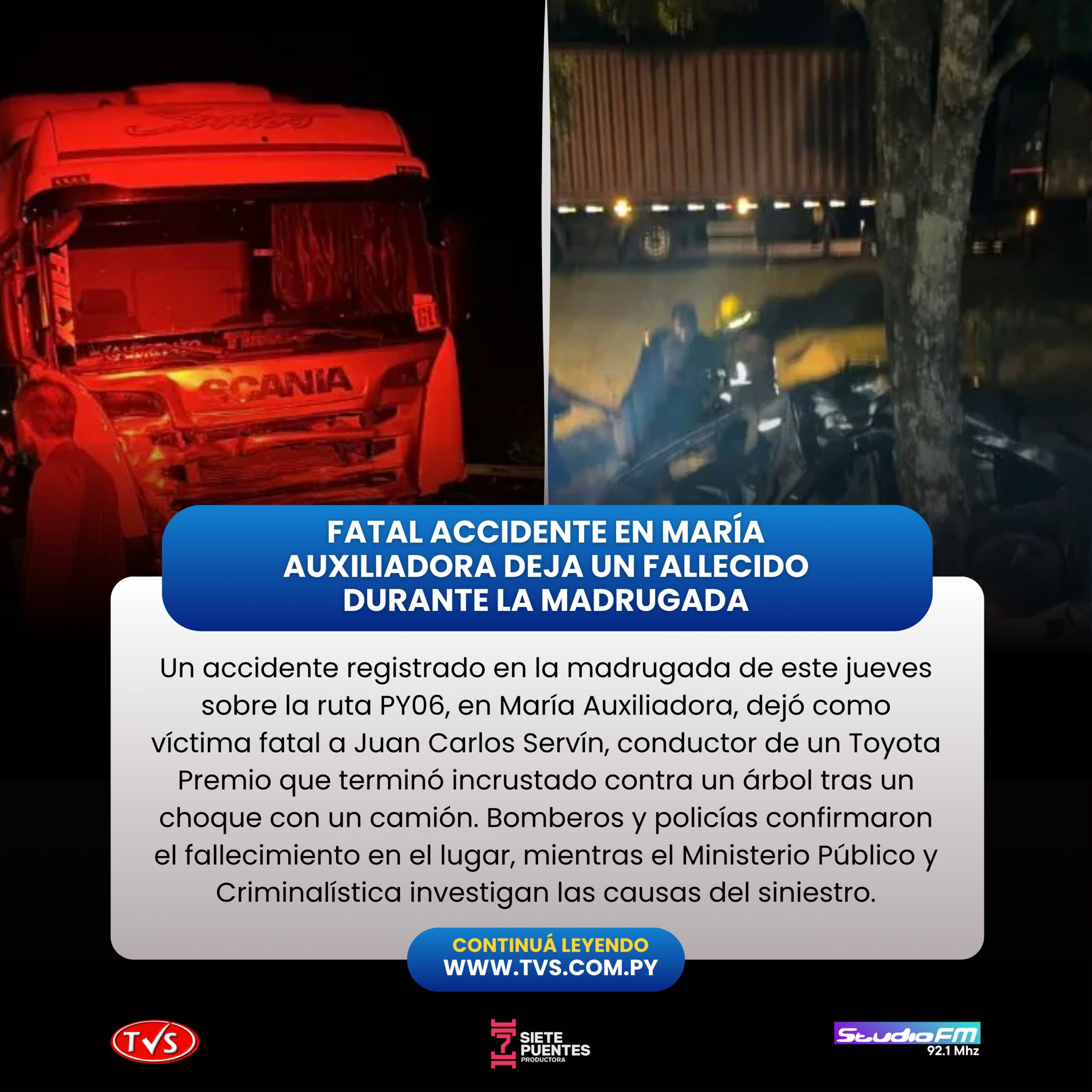 Bomberos Voluntarios Azules de T.R.P. fueron los primeros en intervenir y confirmaron el fallecimiento de Servín, quien quedó atrapado en el interior del vehículo totalmente destrozado. Al llegar el personal policial, el automóvil permanecía incrustado en el árbol, reflejando la magnitud del impacto.