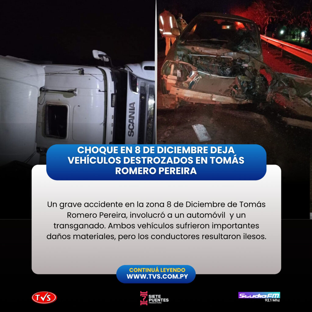 Un grave accidente de tránsito se registró en la zona conocida como 8 de Diciembre, en el distrito de Tomás Romero Pereira, involucrando a un automóvil y un transganado. El choque dejó significativos daños materiales en ambos vehículos, aunque, afortunadamente, no se reportaron heridos.