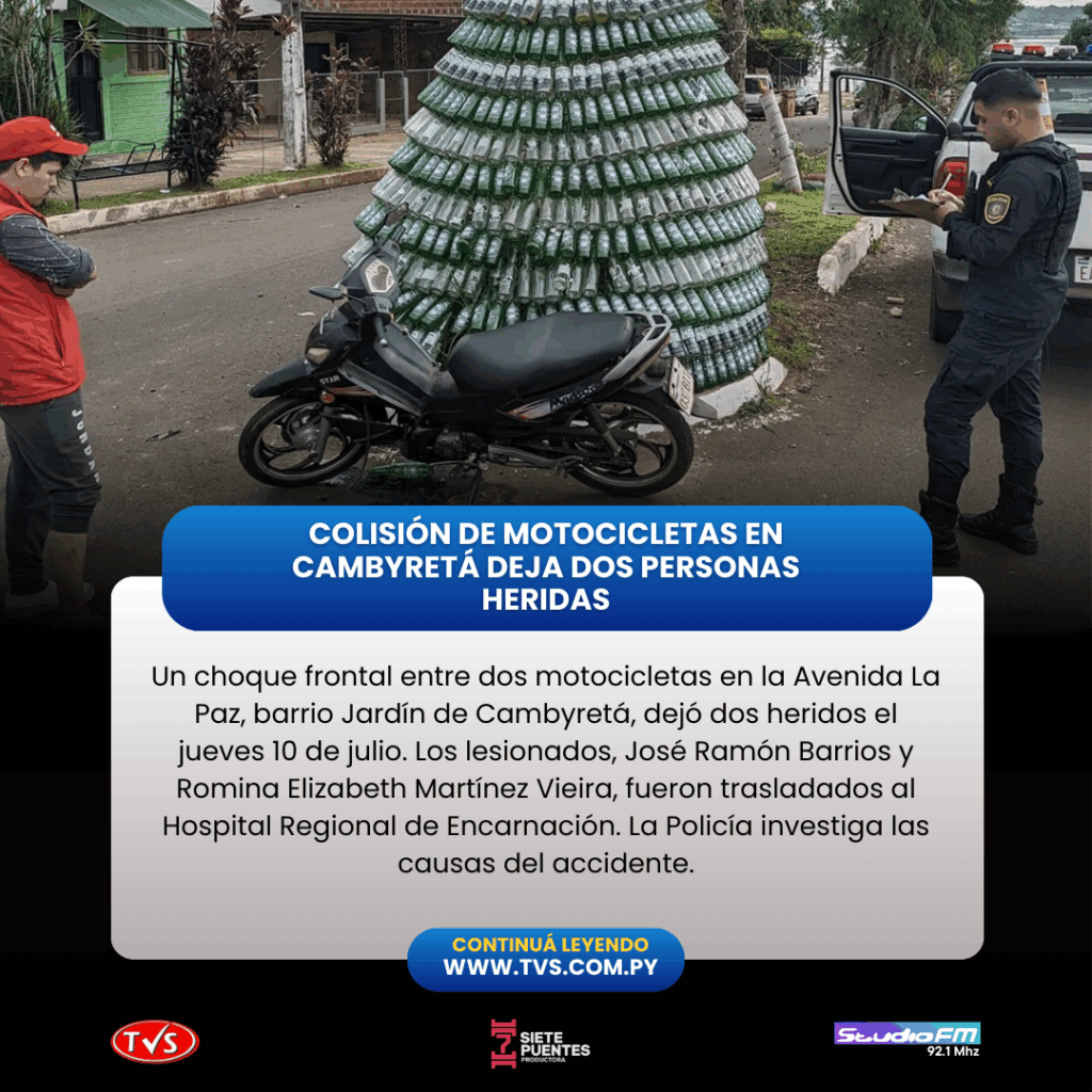 De acuerdo con la información preliminar, los motociclistas colisionaron de frente en el tramo señalado. Tras el impacto, ambos resultaron lesionados y fueron atendidos rápidamente por el Cuerpo de Bomberos Voluntarios, quienes los trasladaron al Hospital Regional de Encarnación para recibir tratamiento médico.