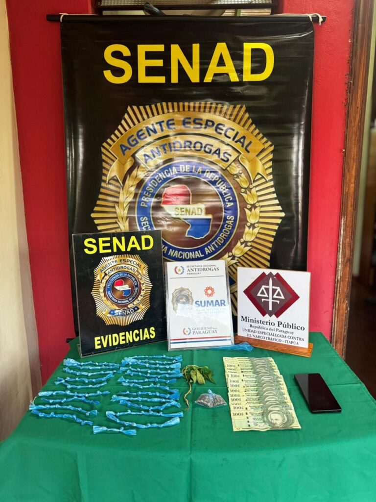 Durante la intervención, los intervinientes incautaron diversas evidencias presuntamente relacionadas con actividades de microtráfico. Entre ellas se encuentran 35,7 gramos de supuesta cocaína (pasta base) distribuidos en 107 dosis, una porción de supuesta marihuana con un peso de 4,5 gramos, un total de G. 1.600.000 en efectivo, un teléfono celular y dos motocicletas.
