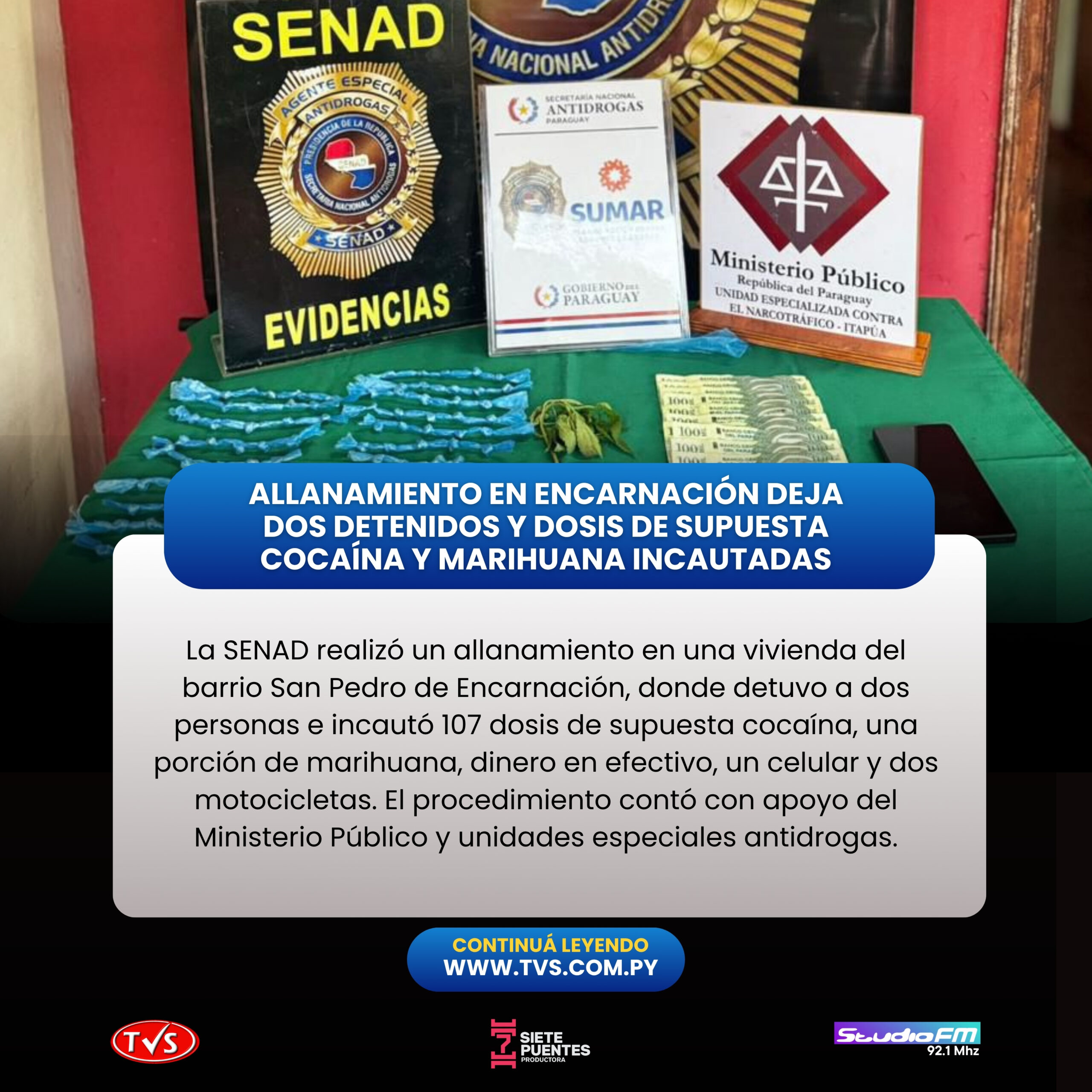 Agentes especiales de la Secretaría Nacional Antidrogas (SENAD), del Departamento Regional N.º 3 Encarnación, en coordinación con fuerzas especiales del Departamento Regional N.º 8 San Ignacio Guazú y con acompañamiento de la Unidad Especializada en la Lucha contra el Narcotráfico del Ministerio Público, realizaron un allanamiento en una vivienda del barrio San Pedro de Encarnación. El operativo se llevó a cabo el 18 de noviembre de 2025, a las 17:28 horas.