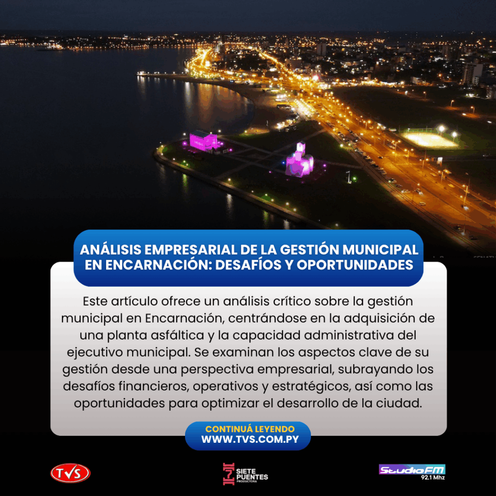 La entrevista de César Rojas en Studio Noticias pone de manifiesto los desafíos estructurales y financieros que enfrenta la Municipalidad de Encarnación, particularmente en relación con la planta asfáltica. Desde una perspectiva empresarial, su análisis resalta la importancia de una gestión estratégica, la colaboración interinstitucional y la planificación a largo plazo para maximizar los recursos y mejorar la infraestructura de la ciudad. A medida que se acercan las elecciones de 2026, los líderes municipales deben priorizar la capacidad de gestión y la visión estratégica para garantizar un desarrollo sostenible y eficiente de Encarnación.