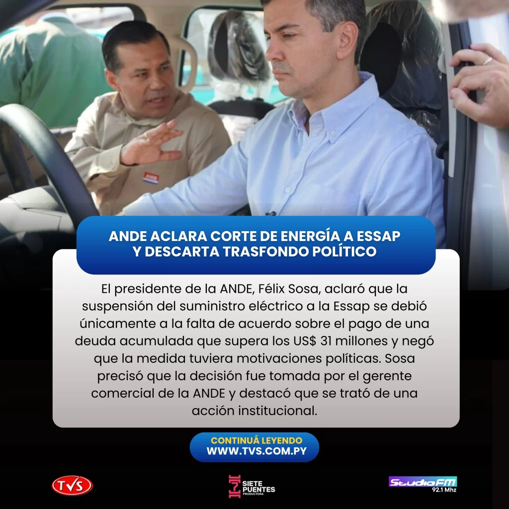 Félix Sosa negó que la suspensión del servicio tuviera motivaciones políticas. “Nunca se mezcló la actividad política con la gestión institucional. La ANDE es como cualquier empresa: si no cobra por sus servicios, no puede invertir ni mejorar su funcionamiento”, señaló.