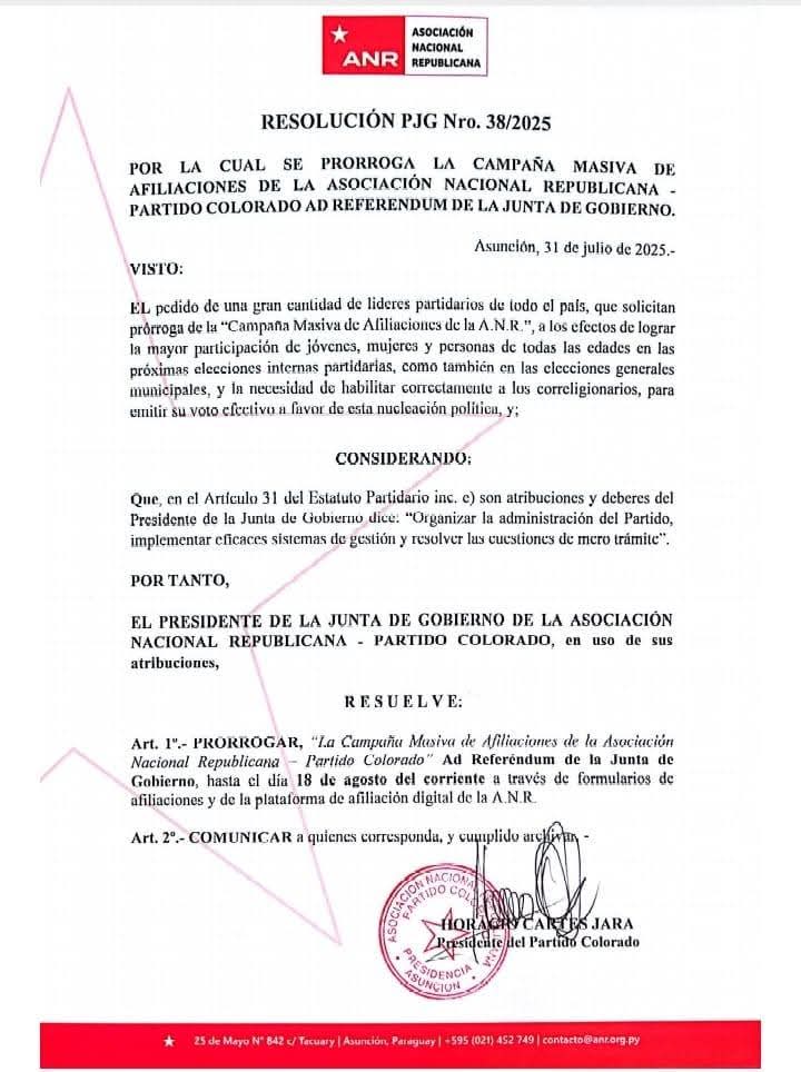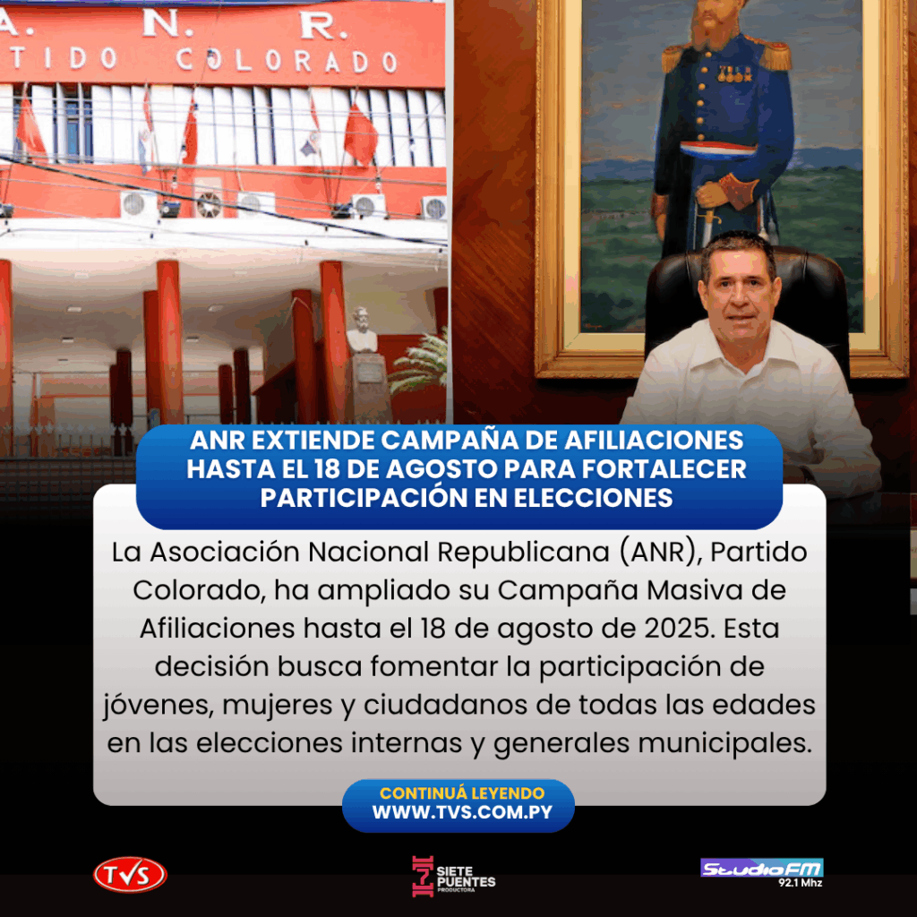 Asunción, 31 de julio de 2025 – La Asociación Nacional Republicana (ANR), Partido Colorado, anunció la extensión de su Campaña Masiva de Afiliaciones hasta el 18 de agosto de 2025, según lo dispuesto en la Resolución PJG Nro. 38/2025, firmada por el presidente de la Junta de Gobierno, Horacio Cartes Jara. La medida, tomada ad referéndum de la Junta de Gobierno, responde a la solicitud de numerosos líderes partidarios de todo el país que buscan ampliar la participación de jóvenes, mujeres y ciudadanos de todas las edades en las próximas elecciones internas y las elecciones generales municipales.