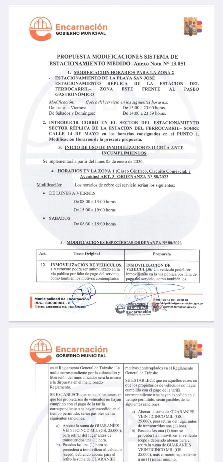 La Municipalidad de Encarnación ha dado a conocer una propuesta de modificación del sistema de estacionamiento medido, la cual incluiría: