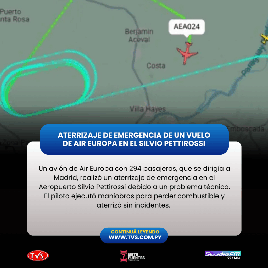 Un avión de la aerolínea Air Europa, con casi 300 personas a bordo, realizó un aterrizaje de emergencia en el Aeropuerto Internacional Silvio Pettirossi, en Luque, este lunes a causa de un problema técnico reportado por el piloto. El vuelo UX024, que tenía como destino Madrid, España, logró descender sin inconvenientes tras declarar una emergencia.