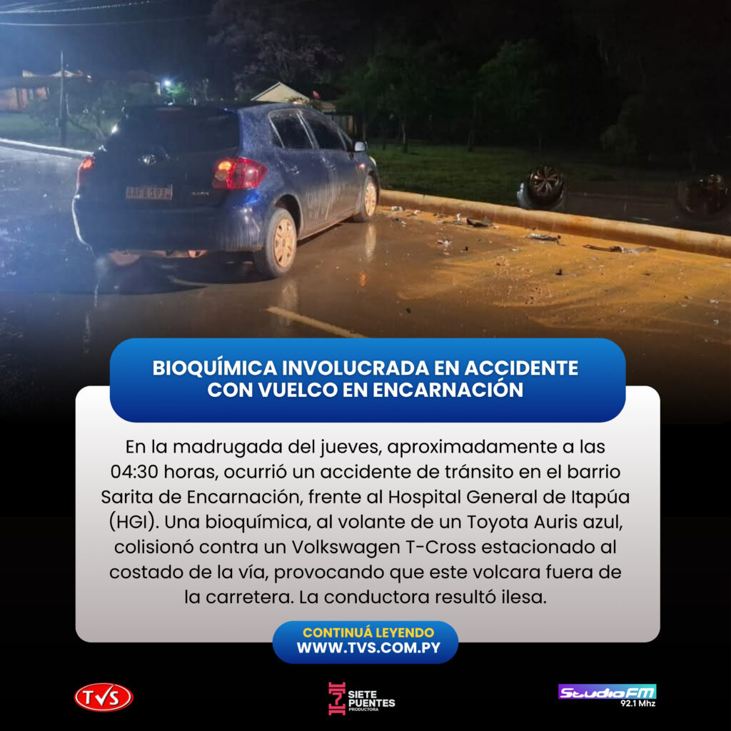 En la madrugada del jueves, cerca de las 04:30 horas, un accidente de tránsito ocurrió en el barrio Sarita de Encarnación, frente al Hospital General de Itapúa (HGI). La protagonista fue Andrea Sofía Villalba Torres, una bioquímica que conducía un Toyota Auris azul.