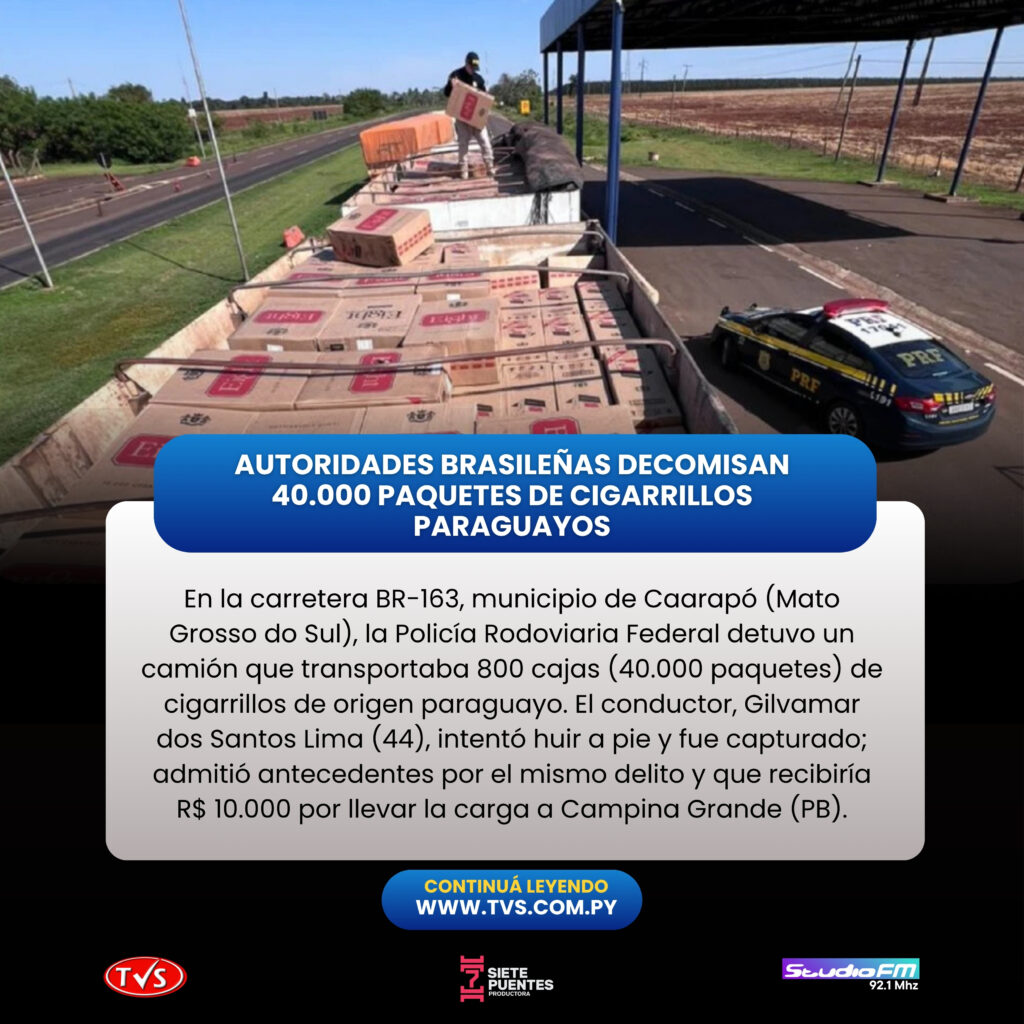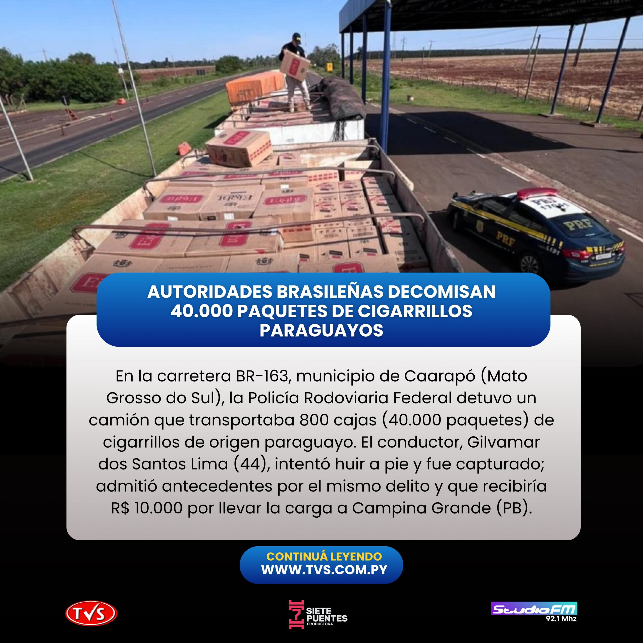 En el interior del semirremolque se encontraron 800 cajas con un total de 40.000 paquetes de cigarrillos de marca paraguaya. Tanto el camión como la mercancía fueron remitidos a la delegación de la Policía Federal en Dourados para los procedimientos legales correspondientes.