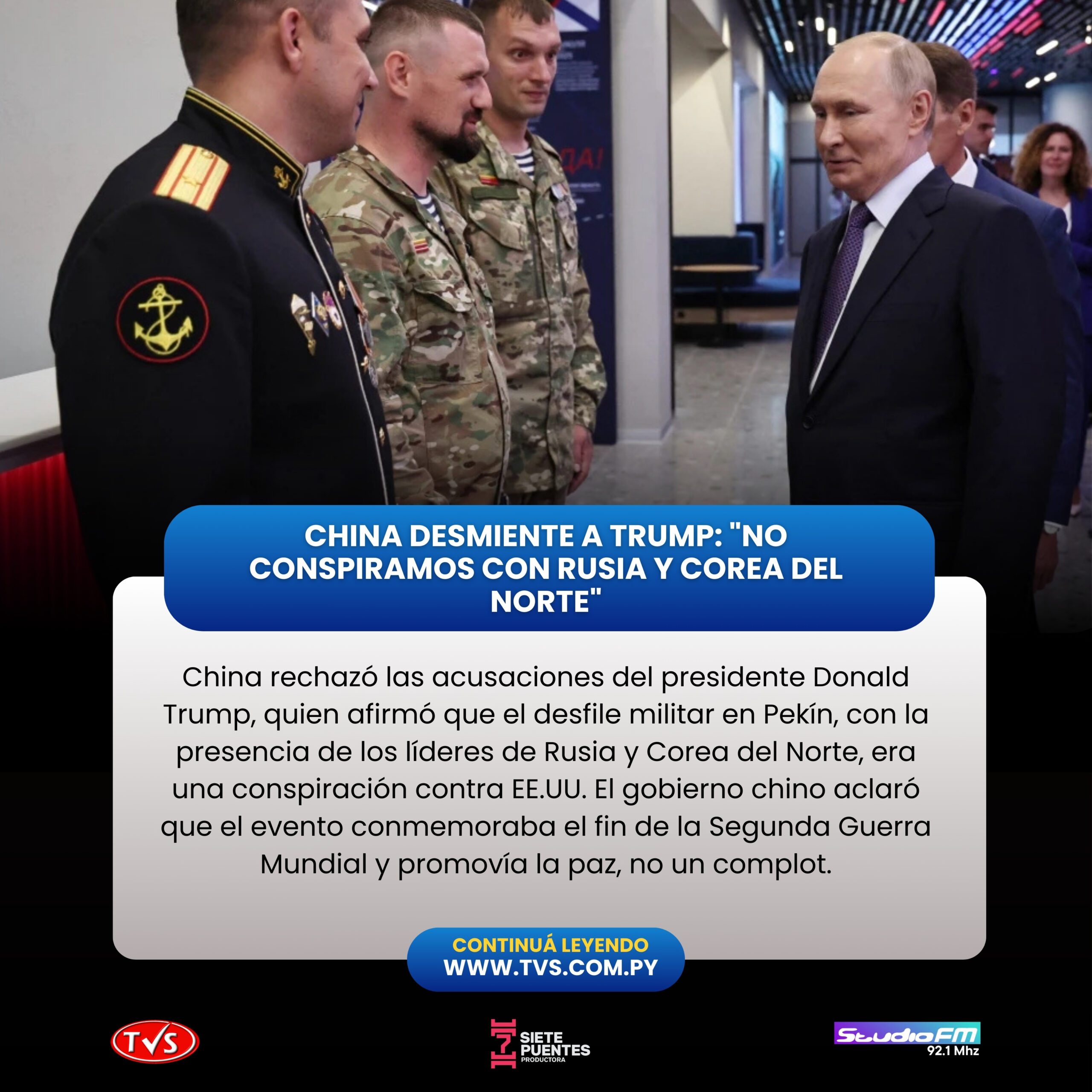 En un mensaje publicado en Truth Social, Trump se dirigió al presidente chino, Xi Jinping, tras el desfile del miércoles, donde China mostró sus últimos avances militares. “Envío mis saludos a Vladimir Putin y Kim Jong Un mientras conspiran contra los Estados Unidos de América”, escribió Trump.