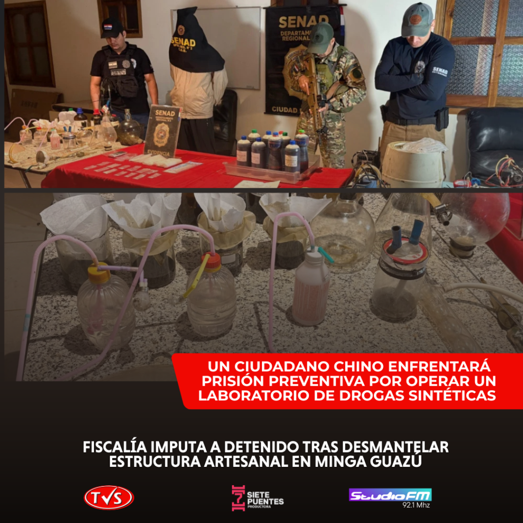 En un operativo antidrogas llevado a cabo el sábado 17 de mayo, agentes de la Secretaría Nacional Antidrogas (Senad) y de la Fiscalía Especializada en la Lucha contra el Narcotráfico desmantelaron un laboratorio clandestino de drogas sintéticas en el kilómetro 24 de la ruta Acaray, en la ciudad de Minga Guazú, Departamento de Alto Paraná. Como resultado de la intervención, Yung Cheng Hsu, un ciudadano chino de 60 años, fue detenido e imputado por el fiscal Elvio Aguilera Vázquez por los delitos de tenencia, elaboración y comercialización de sustancias estupefacientes.