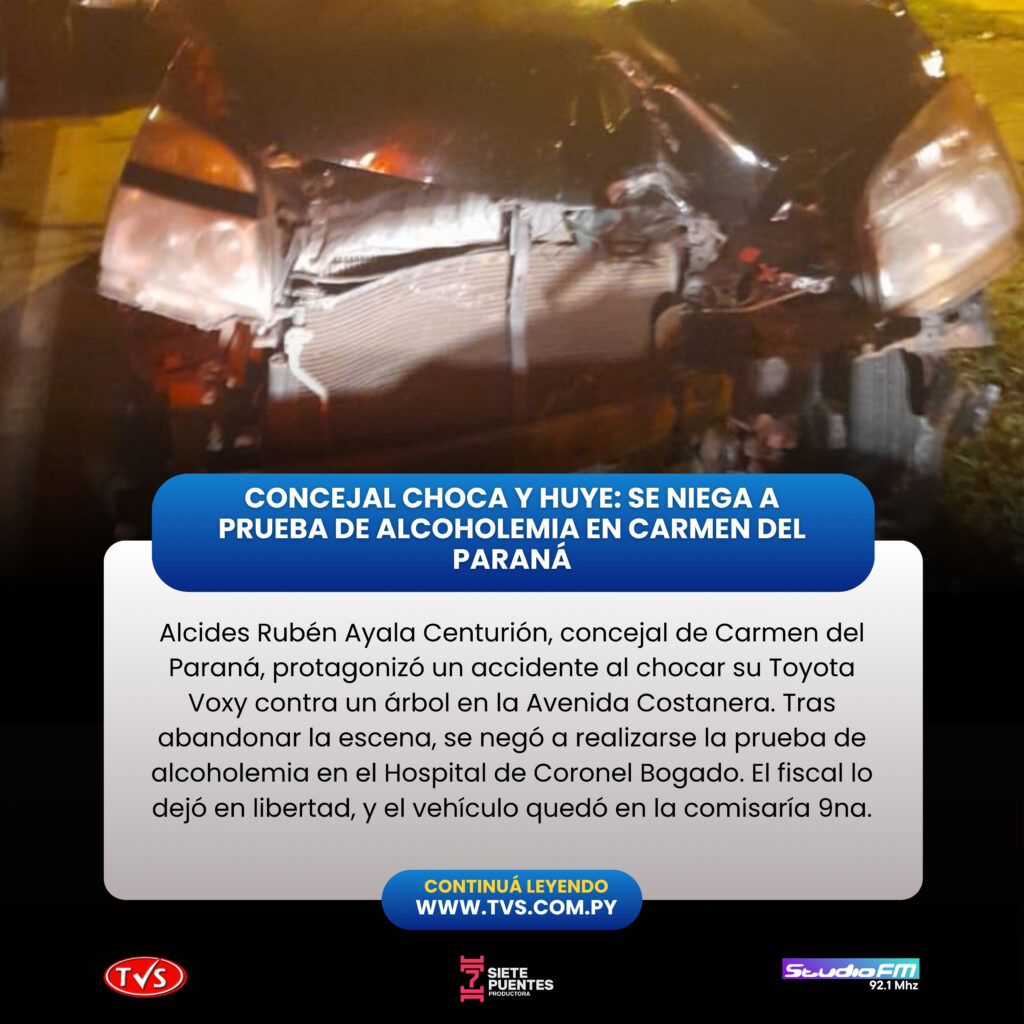 Un accidente de tránsito ocurrido anoche en la Avenida Costanera de Carmen del Paraná, frente a la Playa Ybyku’i, involucró al concejal Alcides Rubén Ayala Centurión, quien supuestamente chocó su vehículo contra un árbol y luego se negó a realizarse una prueba de alcoholemia, según informaron fuentes policiales.