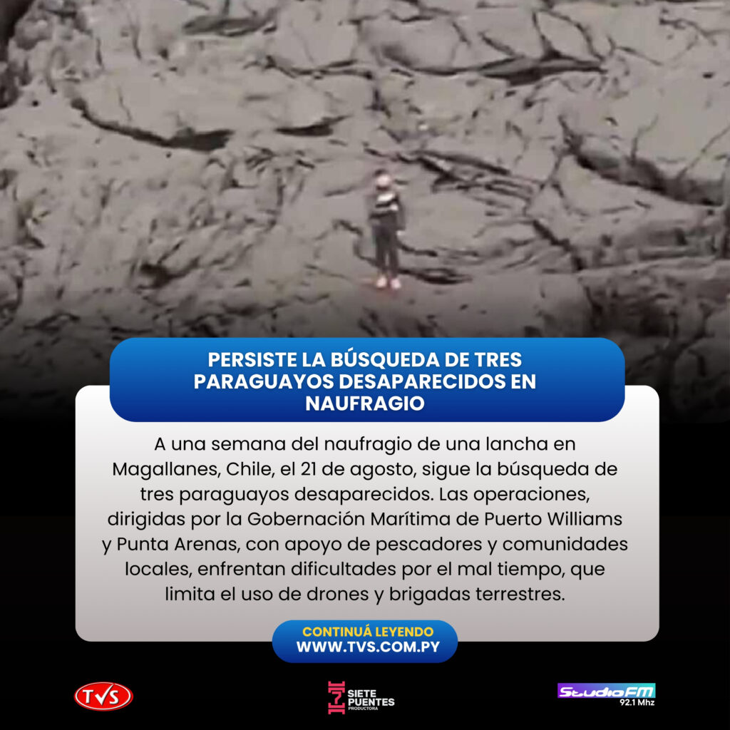 Una semana después del naufragio de la lancha Ana Belén, ocurrido el 21 de agosto en aguas de Magallanes, Chile, sigue la búsqueda de tres paraguayos desaparecidos: Joel Bogado, César González y Fernando González. Las labores, lideradas por la Gobernación Marítima de Puerto Williams y Punta Arenas, cuentan con el apoyo de pescadores y comunidades locales.