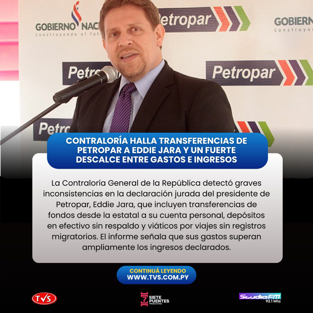 La Contraloría General de la República (CGR) identificó serias inconsistencias en la Declaración Jurada de Bienes y Rentas (DJBR) de Eddie Ramón Jara Rojas, presidente de Petróleos Paraguayos (Petropar), tras un exhaustivo análisis documental y financiero. El informe reúne seis observaciones que incluyen autoasignación de viáticos sin respaldo, depósitos en efectivo por montos elevados, transferencias desde cuentas de la estatal a su cuenta personal y un nivel de gastos que supera ampliamente los ingresos declarados.