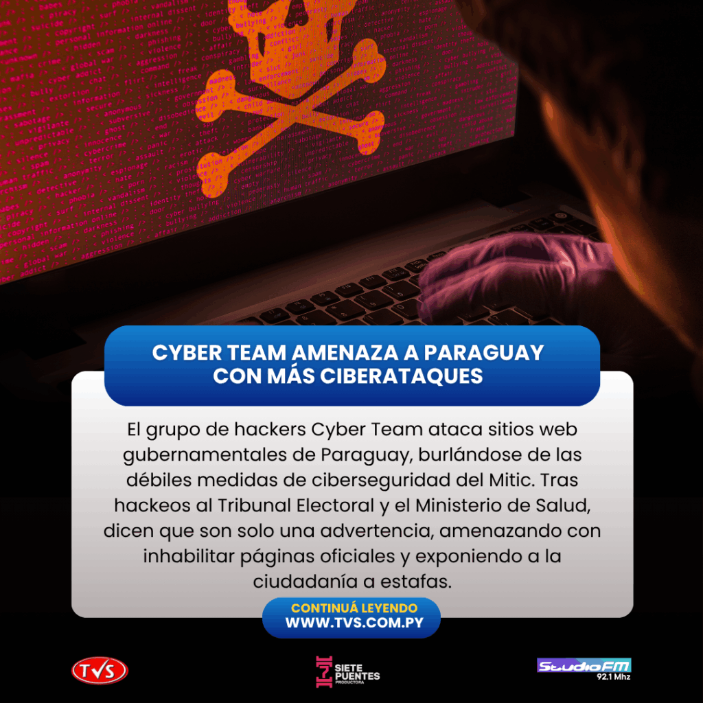 El grupo de hackers conocido como Cyber Team intensificó sus provocaciones contra las autoridades paraguayas, burlándose de las vulnerabilidades en ciberseguridad del país y advirtiendo que los recientes ataques a sitios web gubernamentales son solo una muestra de su capacidad. En un mensaje dirigido al Ministerio de Tecnologías de la Información y Comunicación (Mitic), los ciberdelincuentes aseguraron que la seguridad digital del Gobierno es «flexible» y amenazaron con hacer desaparecer las páginas oficiales de internet: «Cuando queramos, ni siquiera Google los encontrará en línea».