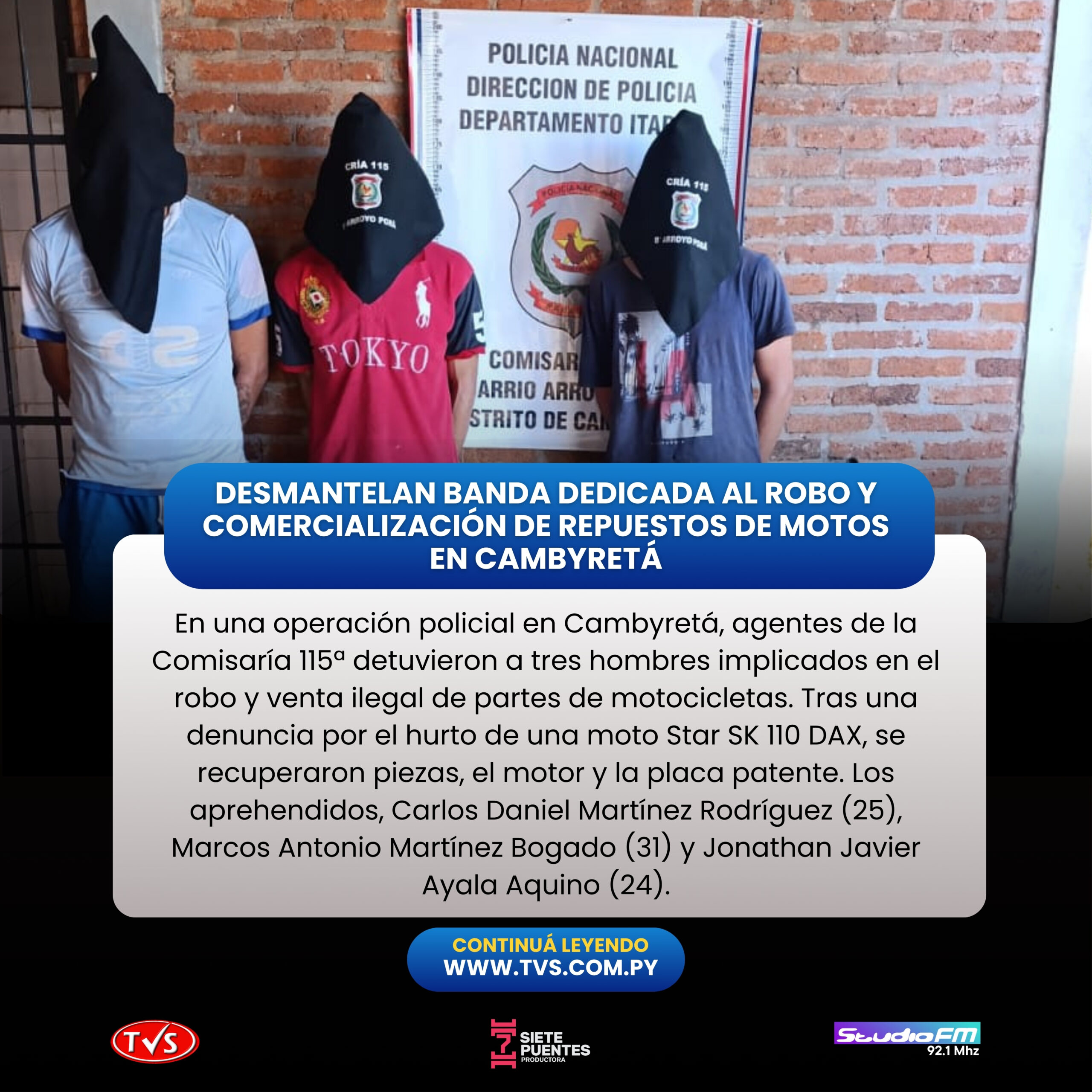 En una efectiva acción de inteligencia y rastreo, agentes de la Comisaría 115ª del barrio Arroyo Porã, en el distrito de Cambyretá, desmantelaron una red involucrada en el hurto y la venta ilícita de componentes de motocicletas. La intervención concluyó con la detención de tres sospechosos y el hallazgo de varias partes pertenecientes a un vehículo denunciado como sustraído.