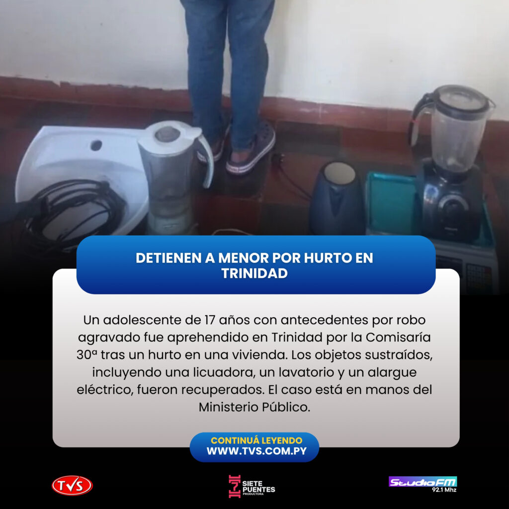 El hecho ocurrió el martes 9 de septiembre a las 14:30, en la vía pública del barrio San Lorenzo, Trinidad. La víctima, Rubén Darío Vera Báez, denunció el robo en su domicilio. Tras la denuncia, los efectivos realizaron patrullajes en la zona, identificando y capturando al sospechoso, quien ya tenía antecedentes por robo agravado en 2023. En su posesión se encontraron una licuadora Britania blanca, un lavatorio cerámico Deca blanco y un alargue eléctrico, todos denunciados como sustraídos.