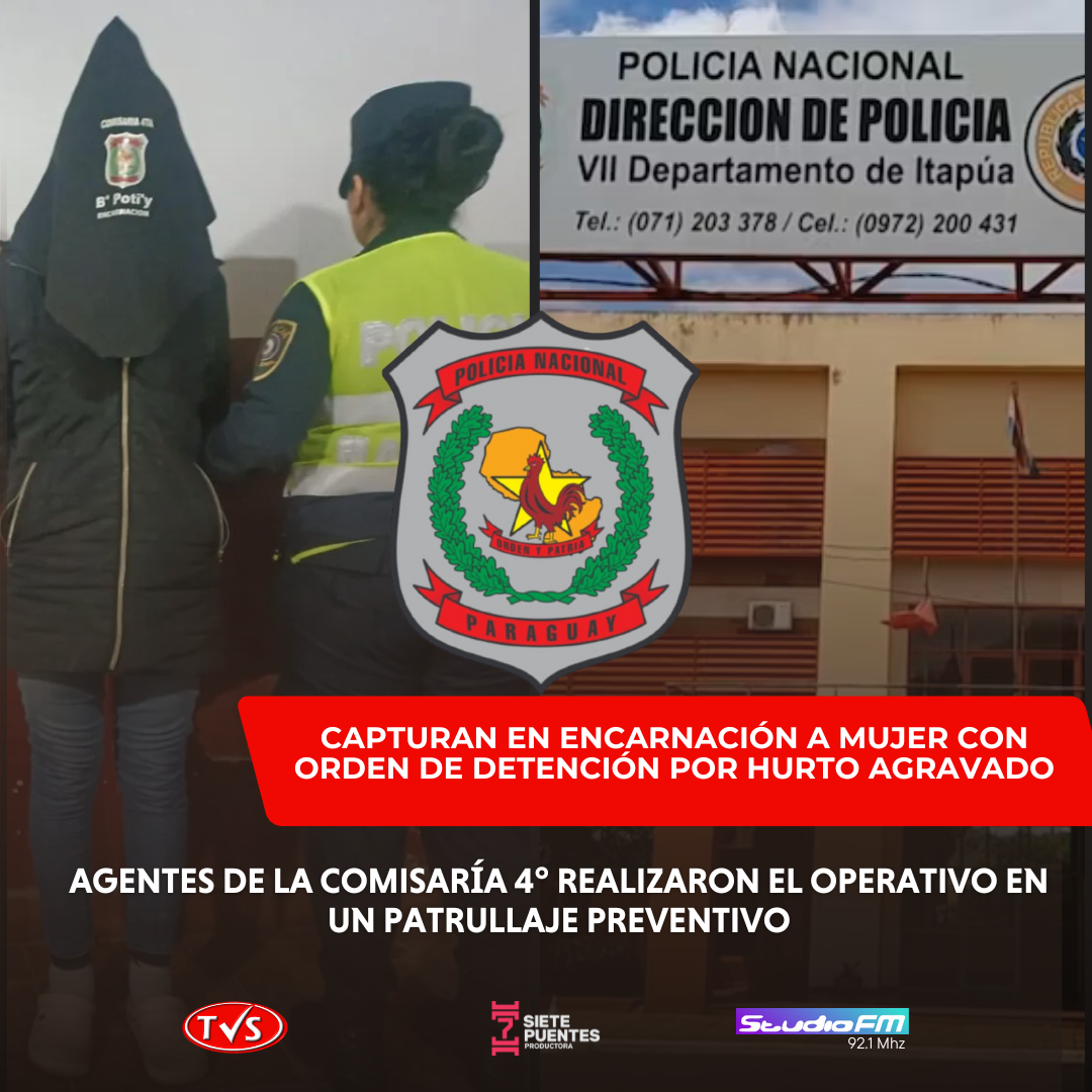 En un operativo realizado por agentes de la Comisaría Cuarta del barrio Poti’y, en Encarnación, fue detenida Paola Beatriz Ramírez Acosta, quien tenía una orden de captura vigente por hurto agravado. La detención se llevó a cabo en cumplimiento del Oficio N° 190, emitido por la actuaria judicial Abog. Patricia María Wasmuth Troche, del Juzgado Penal de Garantías N° 5 de la ciudad.