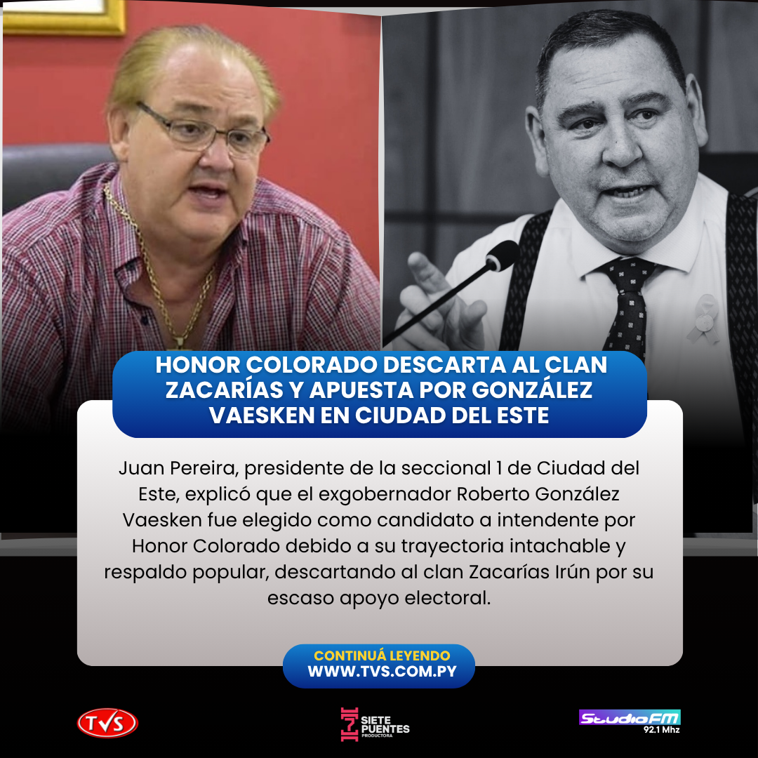 Juan Pereira, presidente de la seccional 1 de Ciudad del Este, reveló los motivos detrás de la elección del exgobernador Roberto González Vaesken como candidato a la intendencia por el movimiento Honor Colorado (HC) de la Asociación Nacional Republicana (ANR), descartando al clan Zacarías Irún para enfrentar al actual intendente, Miguel Prieto.