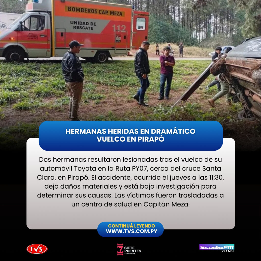 En la mañana del jueves, un vehículo volcó en la Ruta PY07, a aproximadamente 4 km del cruce Santa Clara con la Ruta PY06, bajo la jurisdicción de la Comisaría 76ª del Km 13 de Pirapó. El incidente dejó a dos hermanas heridas y causó importantes daños materiales.
