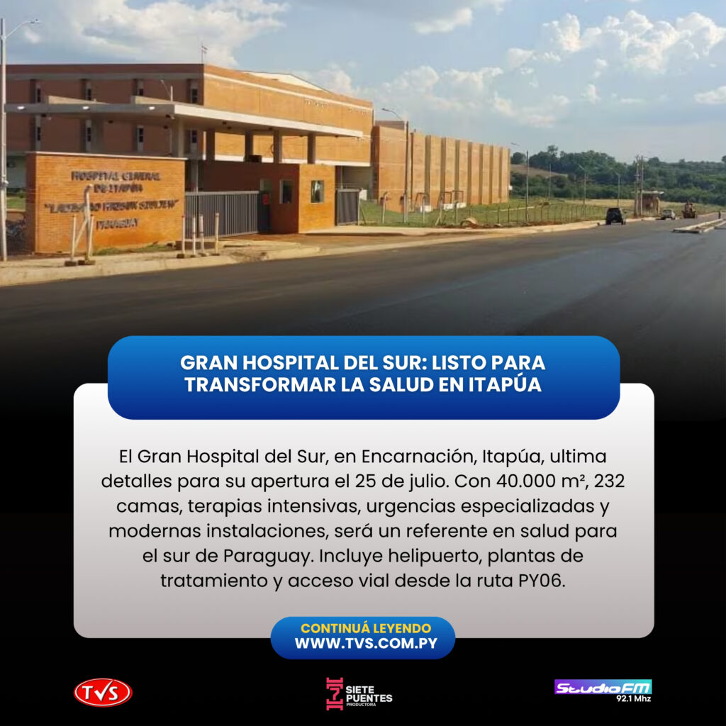 El Gobierno está finalizando los preparativos del Gran Hospital del Sur, ubicado en el departamento de Itapúa, para asegurar que la infraestructura esté lista para su apertura oficial el próximo 25 de julio.