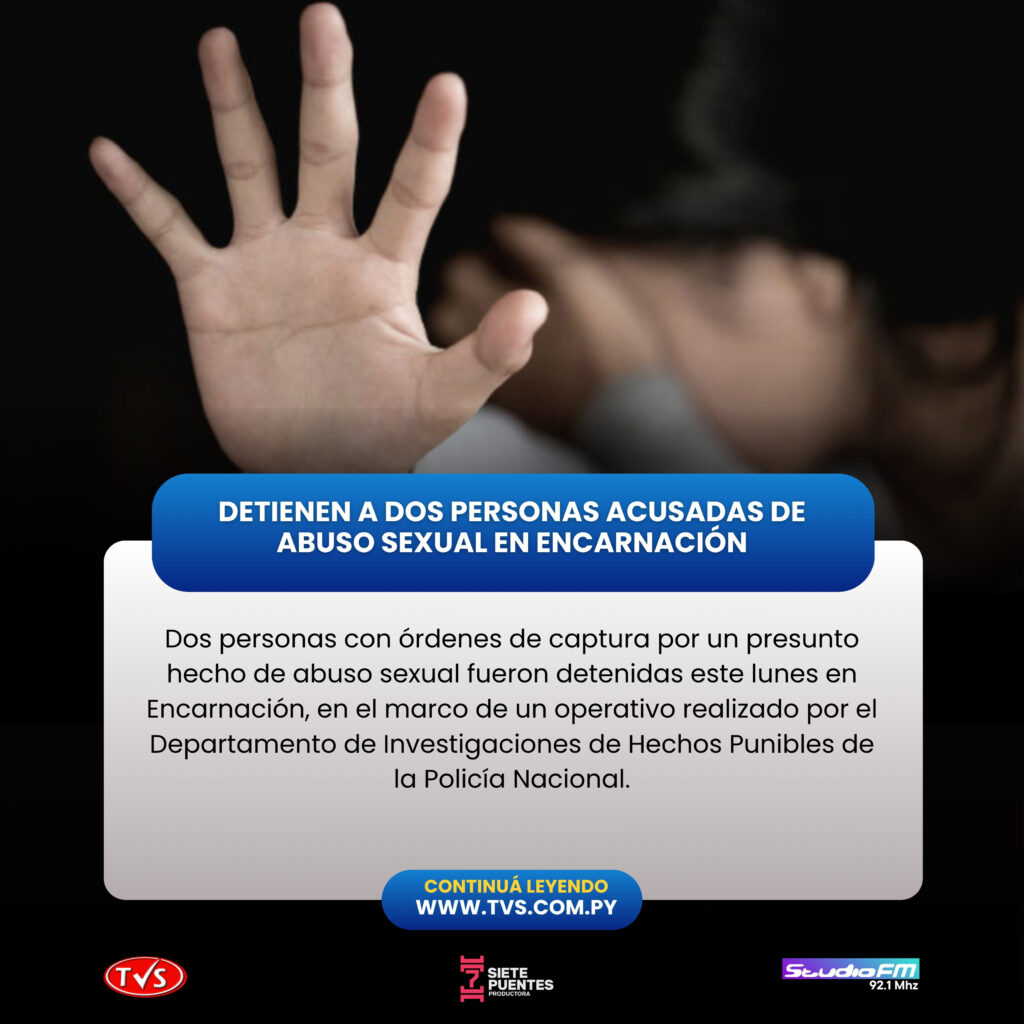 Dos personas con órdenes de captura por un presunto hecho de abuso sexual fueron detenidas este lunes en Encarnación, en el marco de un operativo realizado por el Departamento de Investigaciones de Hechos Punibles de la Policía Nacional.