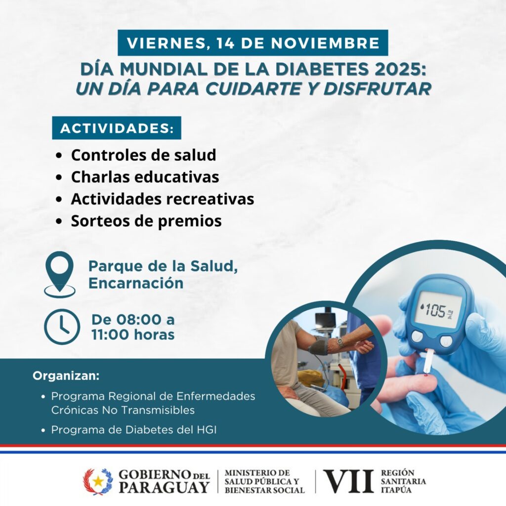 El próximo 14 de noviembre se recordará el Día Mundial de la Diabetes, fecha que busca generar conciencia sobre esta enfermedad crónica que afecta a millones de personas en todo el mundo. En Encarnación, el programa de diabetes del HGI, prepara una jornada especial en el Parque de la Salud, con actividades abiertas al público enfocadas en la detección temprana, la prevención y la educación sobre hábitos saludables.