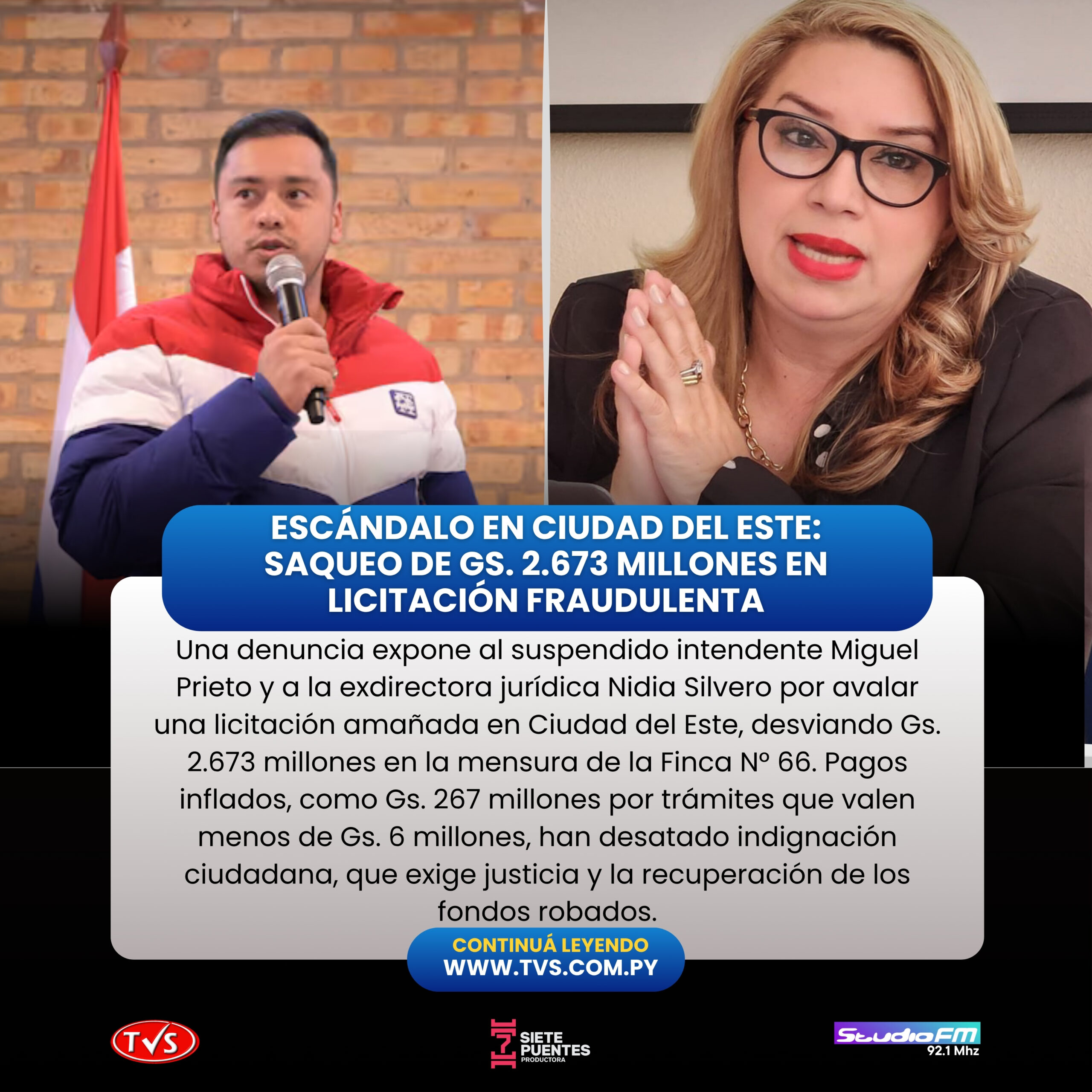 Una grave denuncia ha sacudido a la ciudadanía de Ciudad del Este, revelando un presunto esquema de corrupción que involucra al suspendido intendente Miguel Prieto y a la exdirectora jurídica de la municipalidad, Nidia Silvero. Según la acusación, ambos habrían avalado una licitación amañada que permitió el desvío de Gs. 2.673 millones en fondos públicos destinados a la mensura de la Finca N° 66.