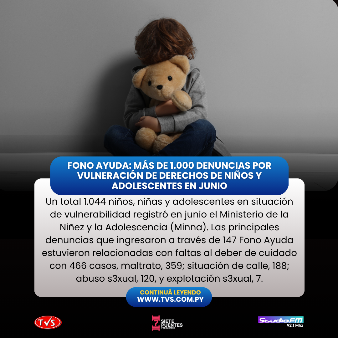 En junio de 2025, el Ministerio de la Niñez y la Adolescencia (Minna) registró un total de 1.044 casos de niños, niñas y adolescentes en situación de vulnerabilidad a través de la línea 147 Fono Ayuda. Las denuncias más frecuentes incluyeron faltas al deber de cuidado (466 casos), maltrato (359), situación de calle (188), abuso sexual (120) y explotación sexual (7).