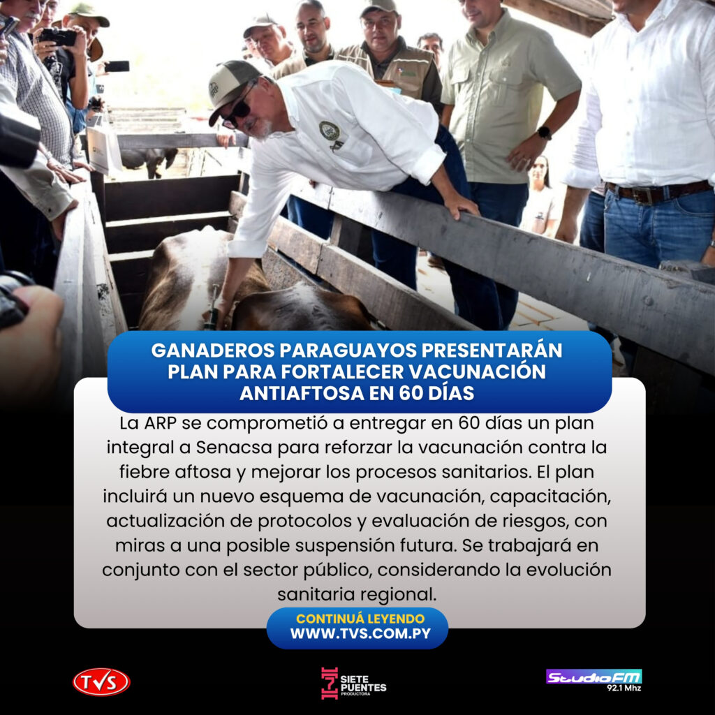La Asociación Rural del Paraguay (ARP), en representación del sector ganadero, se comprometió a entregar en un plazo de 60 días al Servicio Nacional de Calidad y Salud Animal (Senacsa) un plan integral para fortalecer los procesos sanitarios, con especial enfoque en la continuidad de la vacunación contra la fiebre aftosa. Este documento servirá como base para evaluar futuras decisiones sobre la posible suspensión de la vacunación. El compromiso se formalizó tras una reunión entre autoridades estatales y representantes del sector ganadero, donde se acordó formar un equipo técnico para elaborar el plan.
