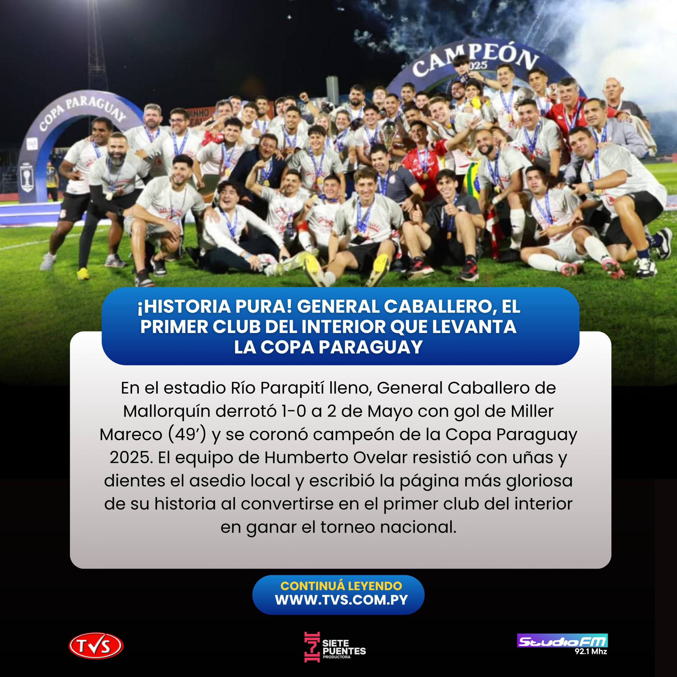 En una noche inolvidable en el estadio Río Parapití de Pedro Juan Caballero, General Caballero de Juan León Mallorquín se coronó campeón de la Copa Paraguay 2025 al vencer 1-0 a 2 de Mayo y se convirtió en el primer equipo del interior del país en levantar este trofeo.