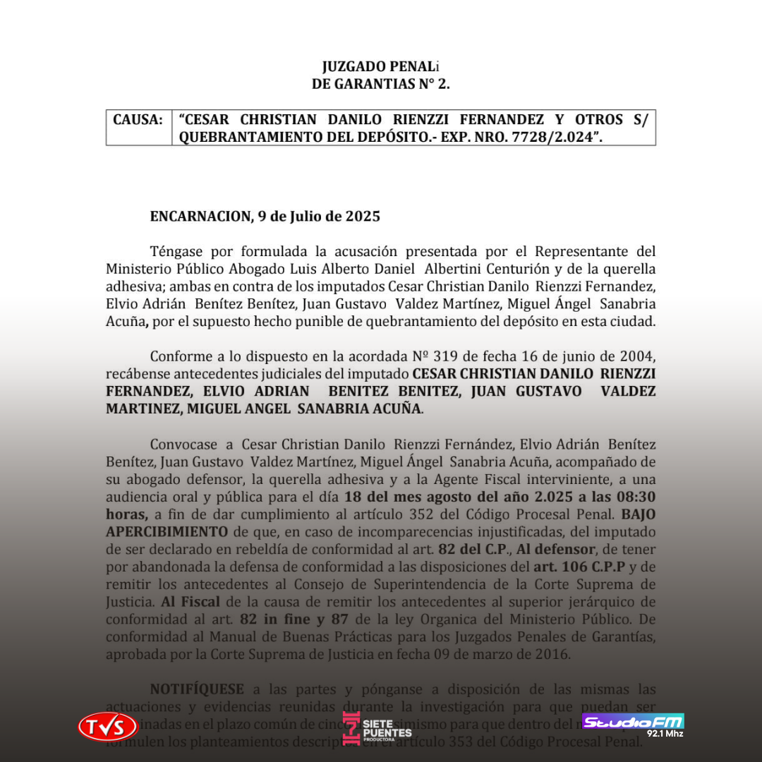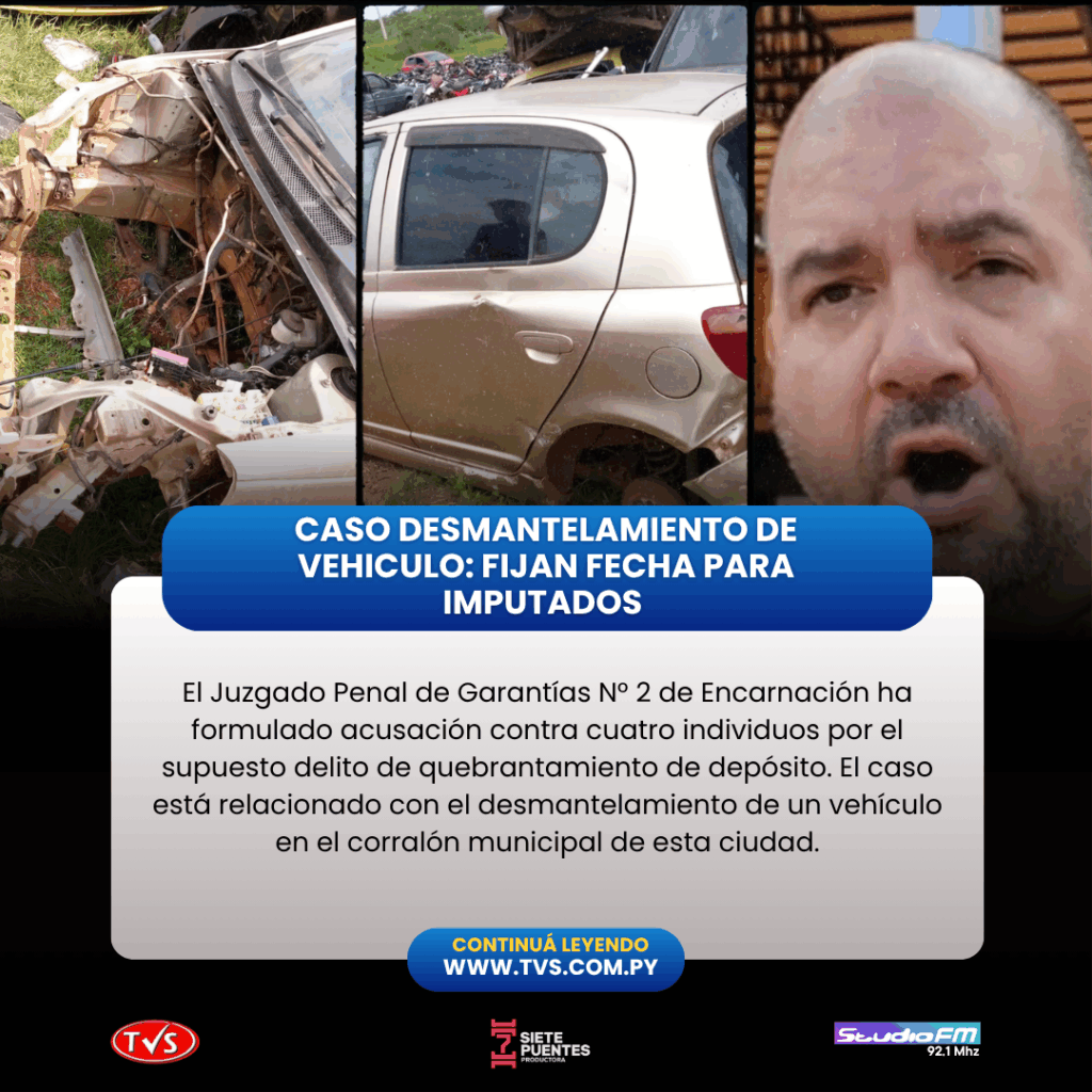 El Juzgado Penal de Garantías N° 2 de Encarnación ha aceptado la acusación contra César Christian Danilo Rienzzi Fernández, Elvio Adrián Benítez Benítez, Juan Gustavo Valdez Martínez y Miguel Ángel Sanabria Acuña por el supuesto delito de quebrantamiento de depósito. La causa, identificada con el expediente N° 7728/2024, está vinculada al desmantelamiento de un vehículo en el corralón municipal de esta ciudad.
