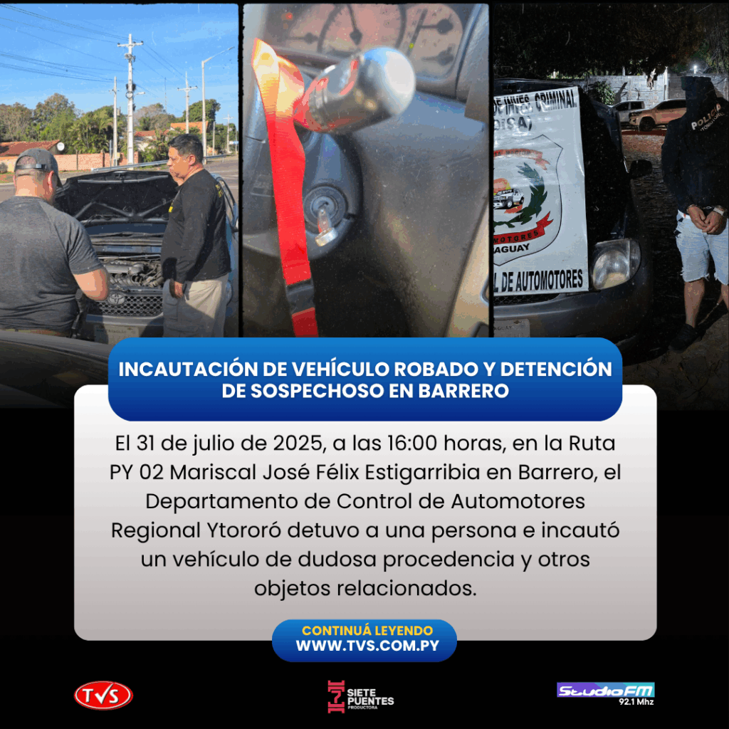 El 31 de julio de 2025, a las 16:00 horas, en un operativo realizado en la vía pública sobre la Ruta PY 02 Mariscal José Félix Estigarribia, en la ciudad de Barrero, el Departamento de Control de Automotores Regional Ytororó llevó a cabo la detención de una persona y la incautación de un vehículo de dudosa procedencia, junto con otros objetos relacionados con el hecho.