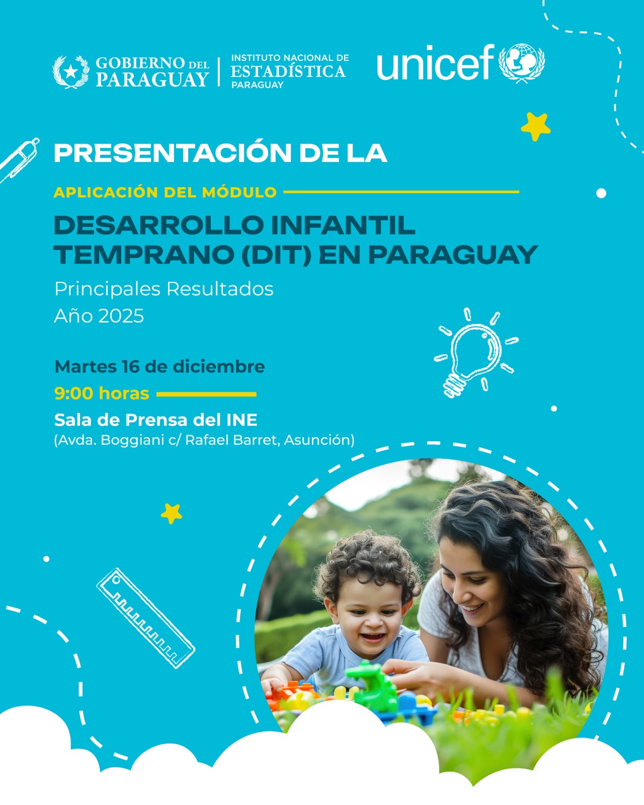 El Instituto Nacional de Estadística (INE) y el Fondo de las Naciones Unidas para la Infancia (UNICEF) presentarán este martes 16 de diciembre los resultados más recientes sobre Desarrollo Infantil Temprano (DIT) en Paraguay. El evento se realizará a las 9:00 horas en la Sala de Prensa del INE, ubicada en Avenida Boggiani casi Rafael Barret, Asunción.