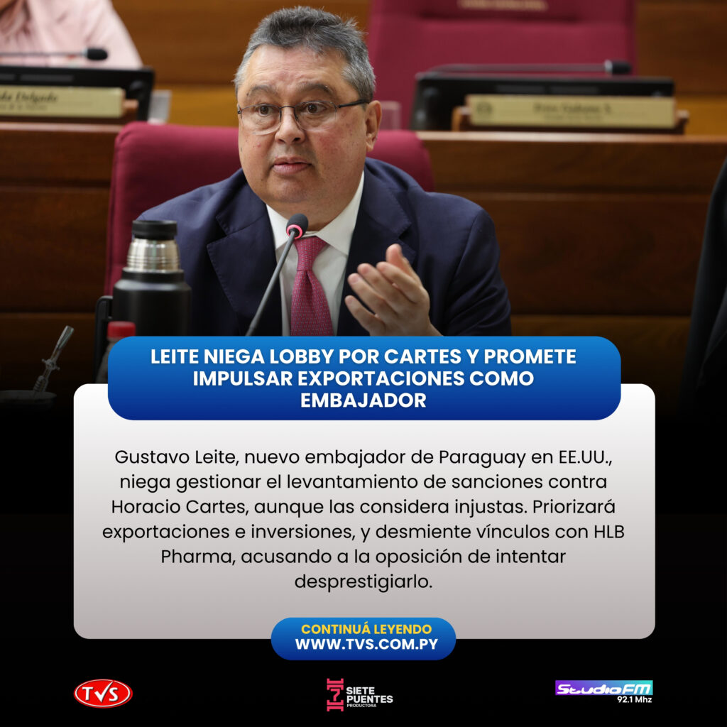 El senador Gustavo Leite, del Partido Colorado y cercano al expresidente Horacio Cartes, fue designado embajador de Paraguay en Estados Unidos. En una entrevista con ABC Cardinal, Leite aseguró que no realizará gestiones para levantar las sanciones impuestas por el gobierno estadounidense anterior a Cartes, acusado de presuntos actos de corrupción.