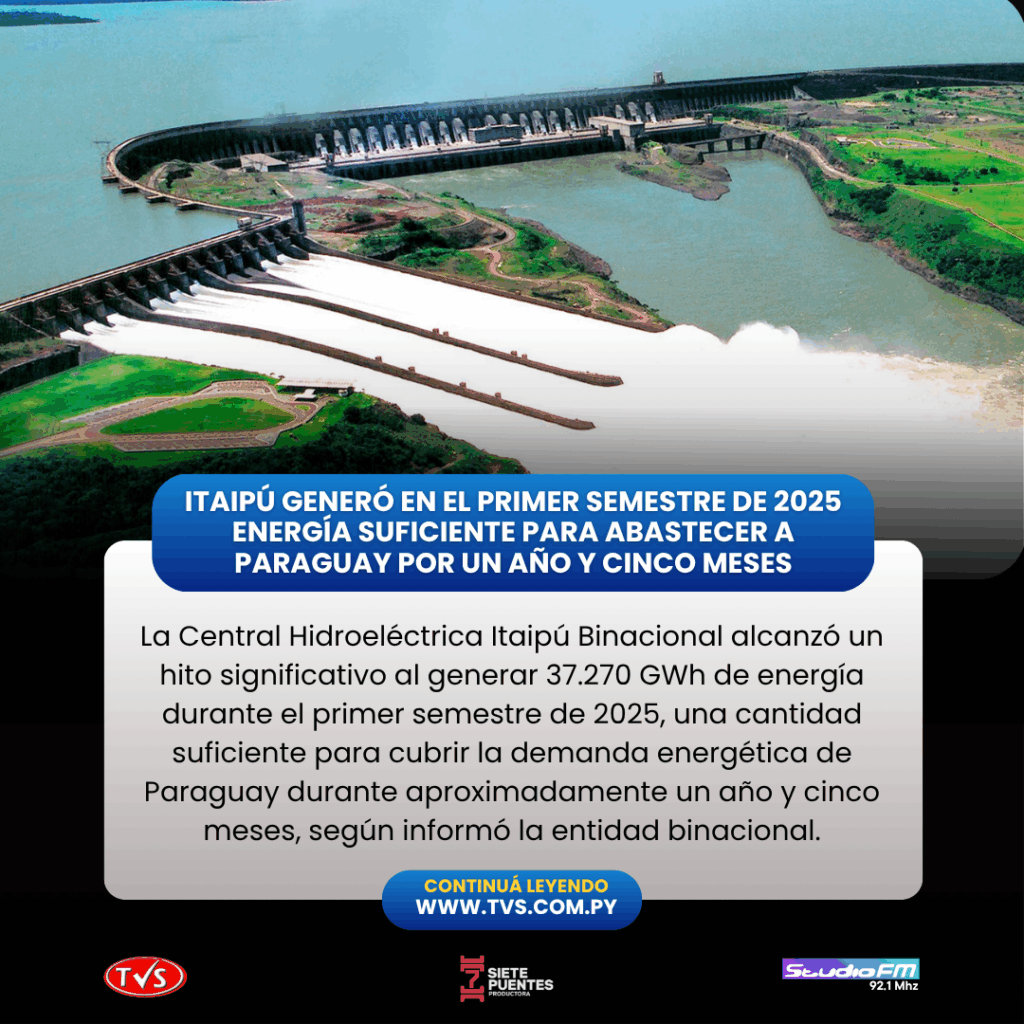 La Central Hidroeléctrica Itaipú Binacional alcanzó un hito significativo al generar 37.270 GWh de energía durante el primer semestre de 2025, una cantidad suficiente para cubrir la demanda energética de Paraguay durante aproximadamente un año y cinco meses, según informó la entidad binacional.