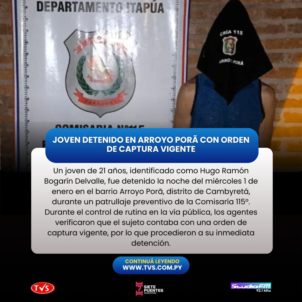 Un joven de 21 años fue detenido la noche del miércoles 1 de enero en el barrio Arroyo Porã, distrito de Cambyretá, durante un patrullaje preventivo de la Comisaría 115°.