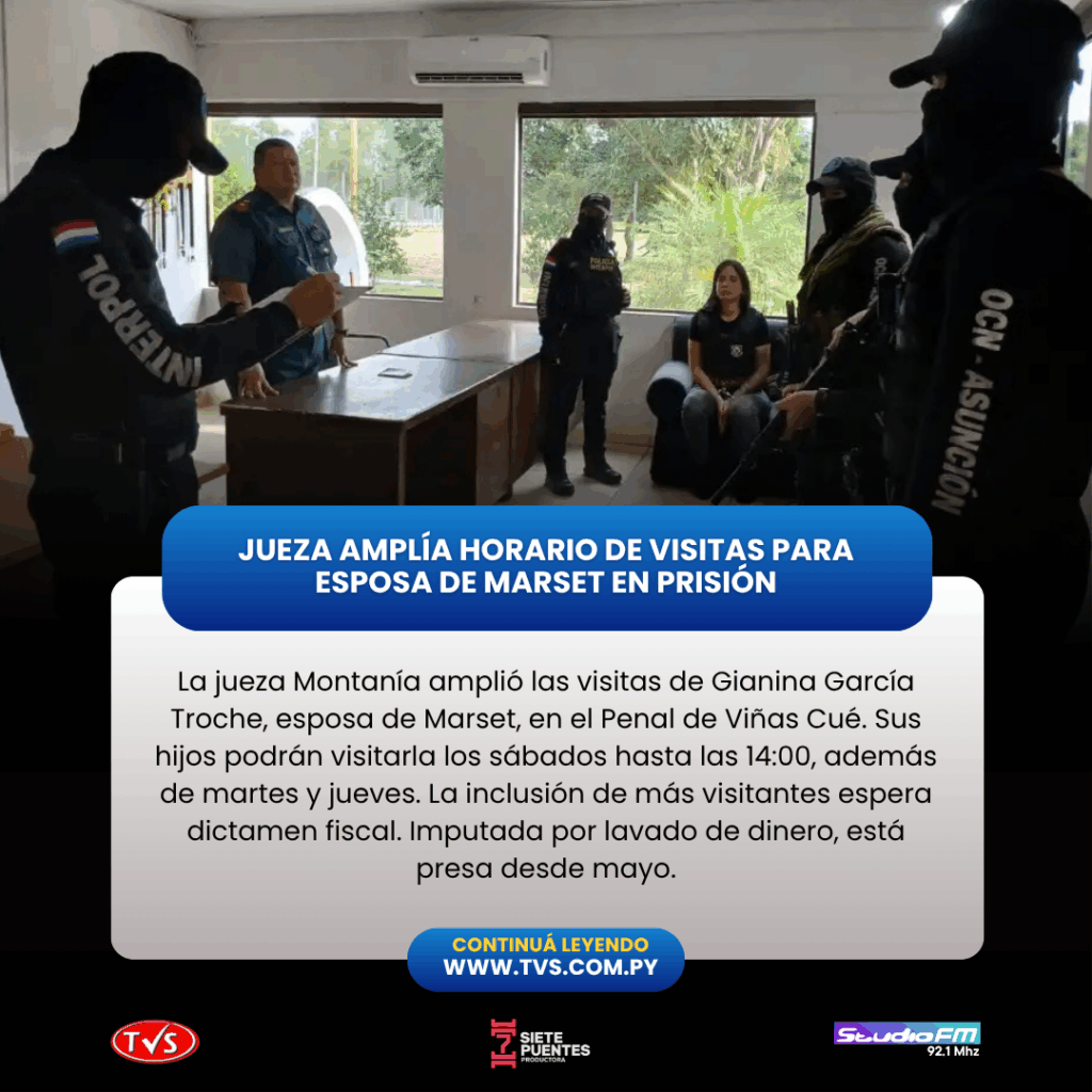 La jueza de Crimen Organizado, Rosarito Montanía, otorgó una extensión en el horario de visitas para Gianina García Troche, esposa del prófugo Sebastián Marset, procesada en el caso A Ultranza Py. La resolución permite que los sábados, García Troche reciba visitas de 09:30 a 14:00 horas en el Penal Militar de Viñas Cué, donde cumple prisión preventiva.