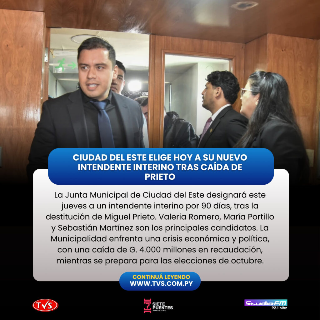 La Junta Municipal de Ciudad del Este designará este jueves a un intendente interino para un periodo de 90 días, en reemplazo de Miguel Prieto, quien fue destituido de su cargo. Entre los principales candidatos figuran los concejales Valeria Romero, María Portillo y Sebastián Martínez.