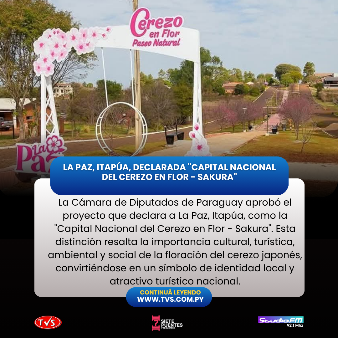 La Cámara de Diputados de Paraguay aprobó, a propuesta del diputado Sebastián Remesowski (ANR–Itapúa), el proyecto de declaración que reconoce al distrito de La Paz, en el Departamento de Itapúa, como la «Capital Nacional del Cerezo en Flor – Sakura». Esta distinción destaca el valor cultural, turístico, ambiental y social que la floración del cerezo japonés representa para la región, consolidándose como un símbolo de identidad local y un atractivo turístico de relevancia nacional.