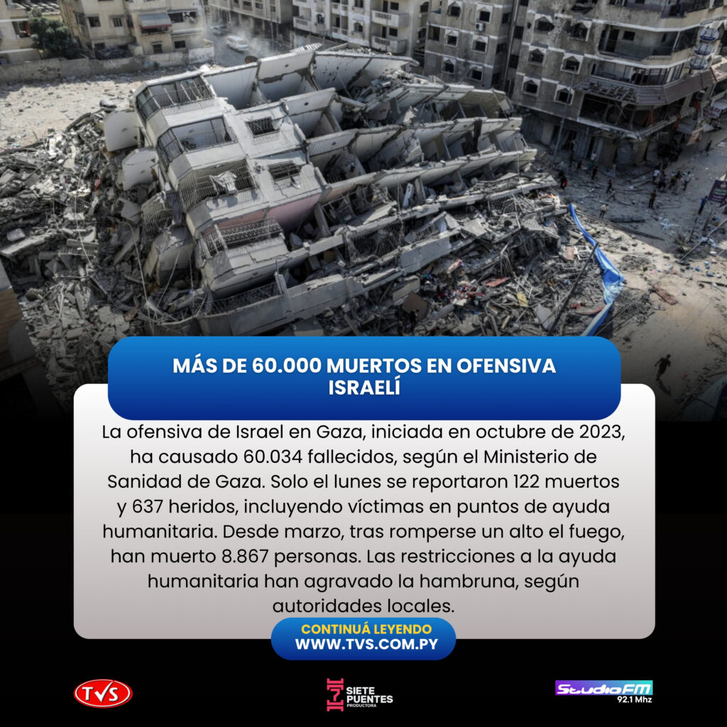 La ofensiva militar de Israel en la Franja de Gaza, iniciada en octubre de 2023, ha dejado un total de 60.034 muertos, según el informe diario publicado este martes por el Ministerio de Sanidad de Gaza, controlado por Hamás, que incluye las víctimas registradas el lunes.