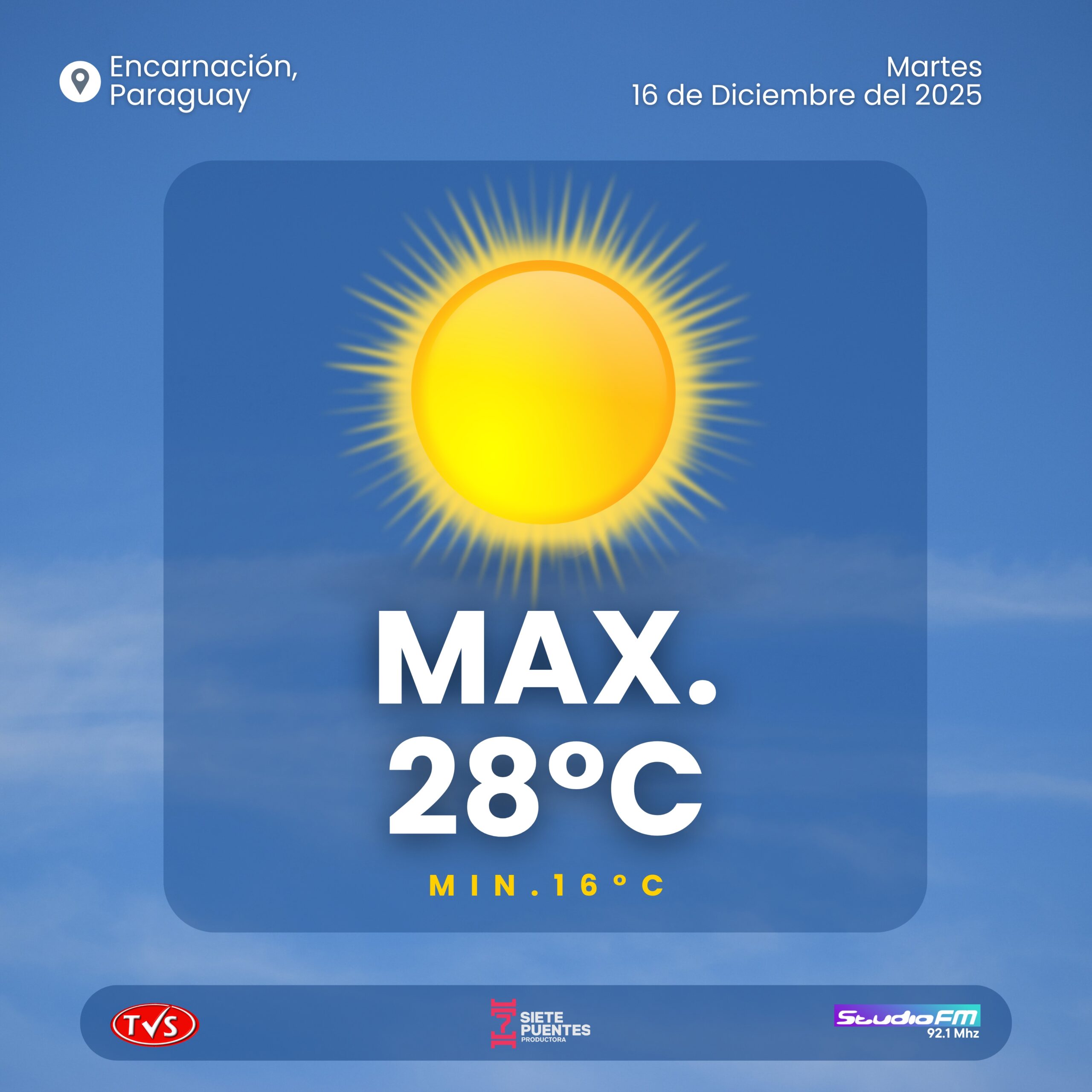 El ambiente se mantiene entre fresco y cálido, con máximas pronosticadas para hoy de 28 grados Celsius en Encarnación y Ciudad del Este, y 30 grados en Asunción y el Chaco.