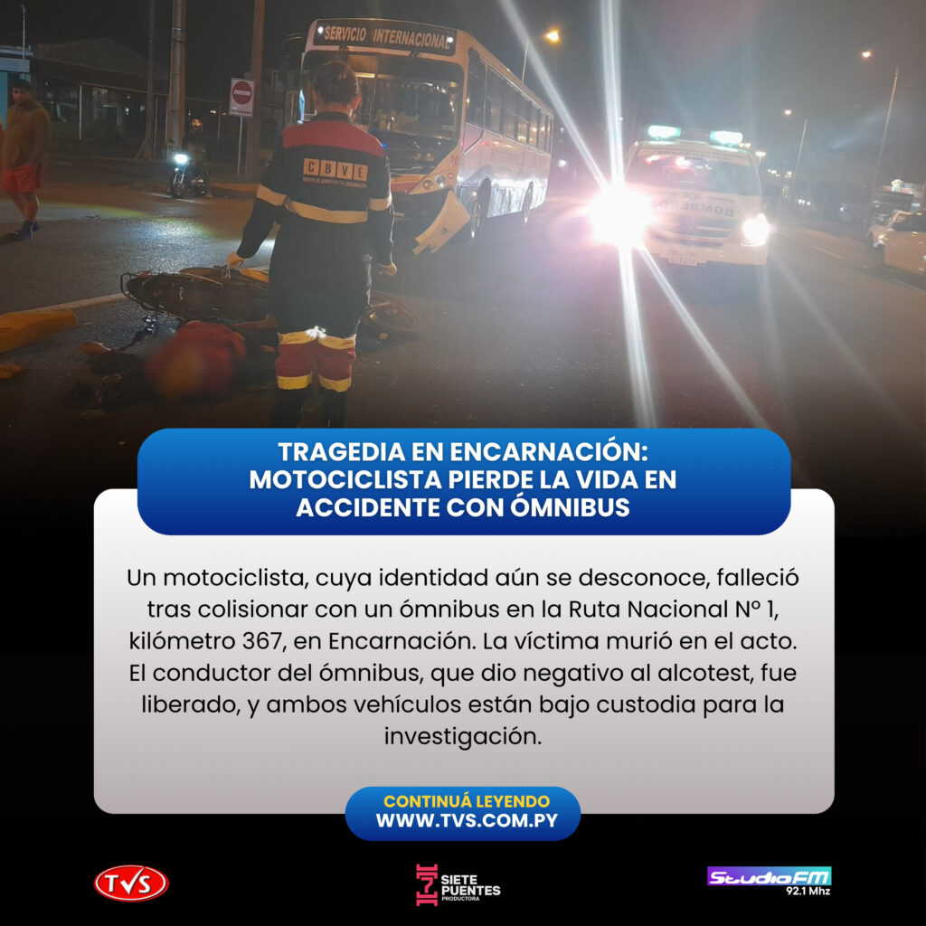 Un trágico accidente de tránsito ocurrió en la Ruta Nacional Nº 1 “Mcal. Francisco Solano López”, a la altura del kilómetro 367, frente a un comercio de repuestos para motocicletas en Encarnación.