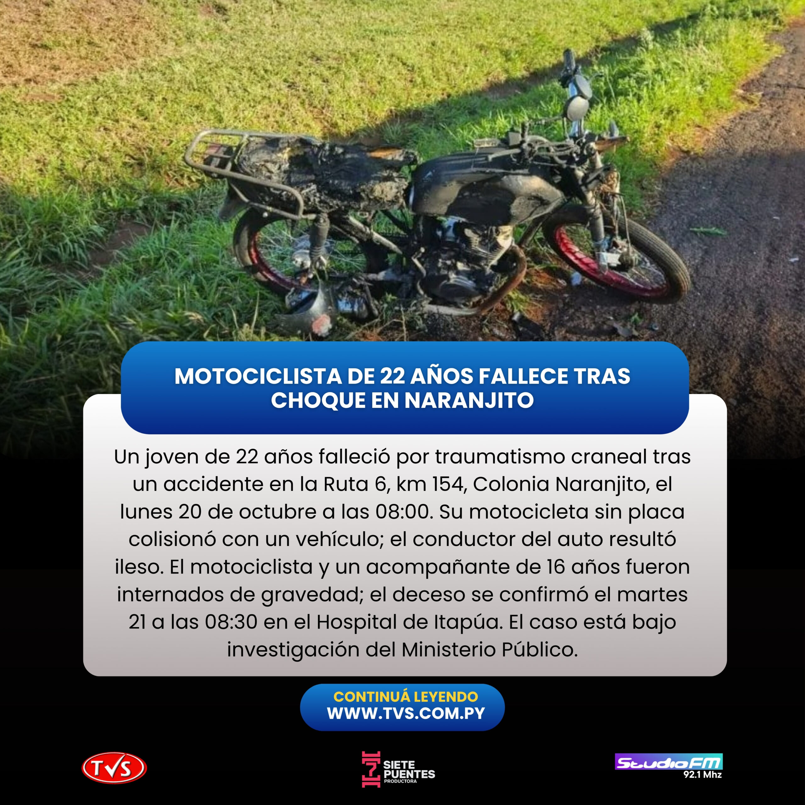 Un joven motociclista perdió la vida a raíz de un grave accidente de tránsito registrado en la Ruta N° 6, en el kilómetro 154 de Colonia Naranjito. El suceso tuvo lugar el lunes 20 de octubre, cerca de las 08:00 horas, de acuerdo con el reporte de la Comisaría 95° de esa localidad.