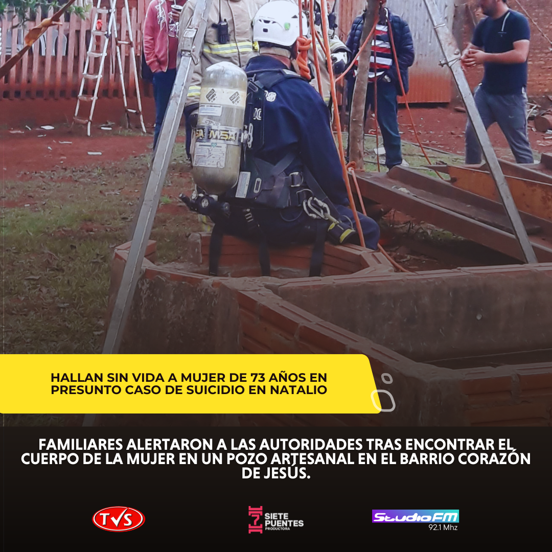 En la madrugada de hoy, la Policía Nacional acudió a una vivienda en el barrio Corazón de Jesús, en la ciudad de Natalio, donde se reportó el hallazgo del cuerpo sin vida de Teresa Jara Viuda de Fleita, de 73 años, en lo que aparenta ser un caso de suicidio.