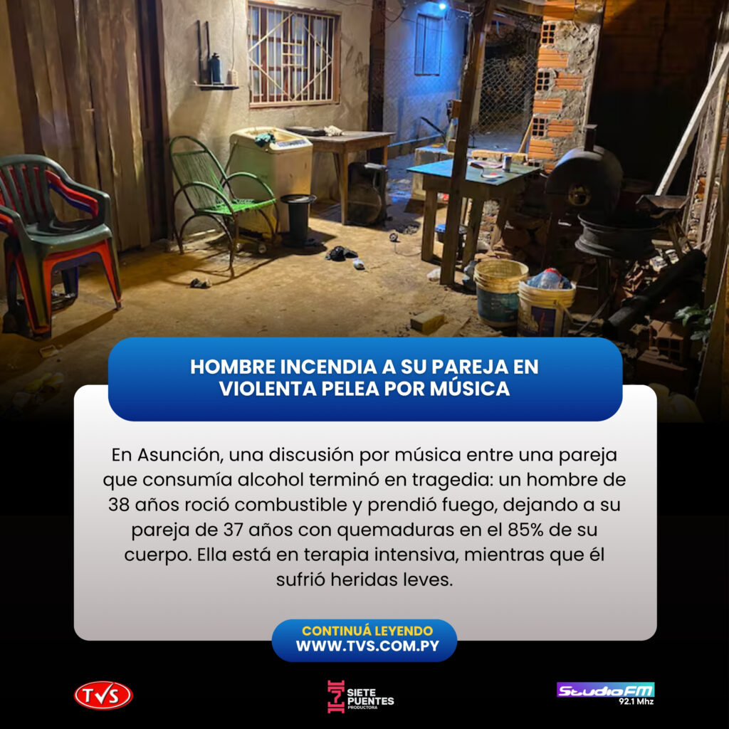 El reporte policial indica que la pareja, mientras consumía alcohol en su vivienda, discutió por la música que sonaba. En ese contexto, Alan Mendieta (38) roció combustible sobre el equipo de sonido, ubicado cerca de su pareja, Librada Celeste Pintos Román (37), y le prendió fuego.