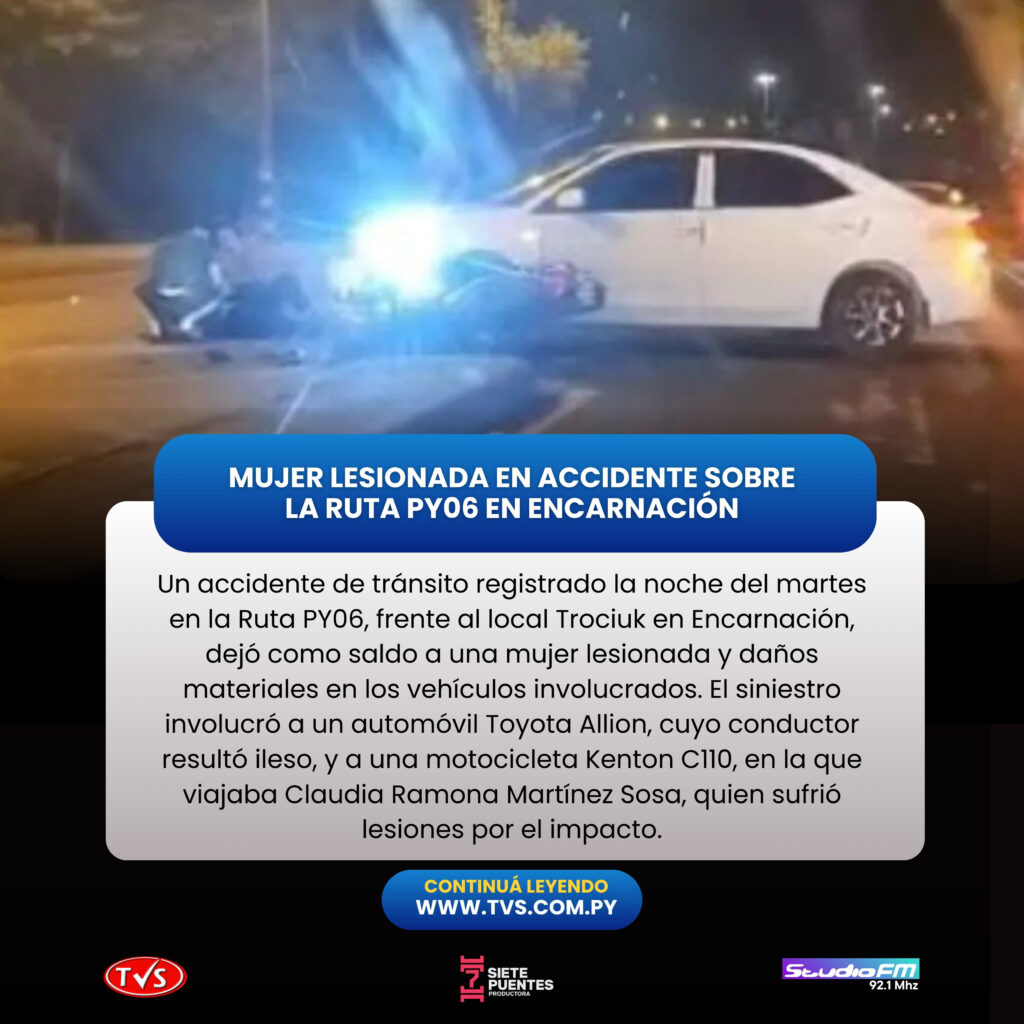 Encarnación, 26 de noviembre de 2025 – Un accidente de tránsito ocurrido en la noche del martes dejó como saldo a una mujer lesionada y daños materiales en la Ruta PY06 Juan León Mallorquín, frente al local comercial Trociuk, en Encarnación.